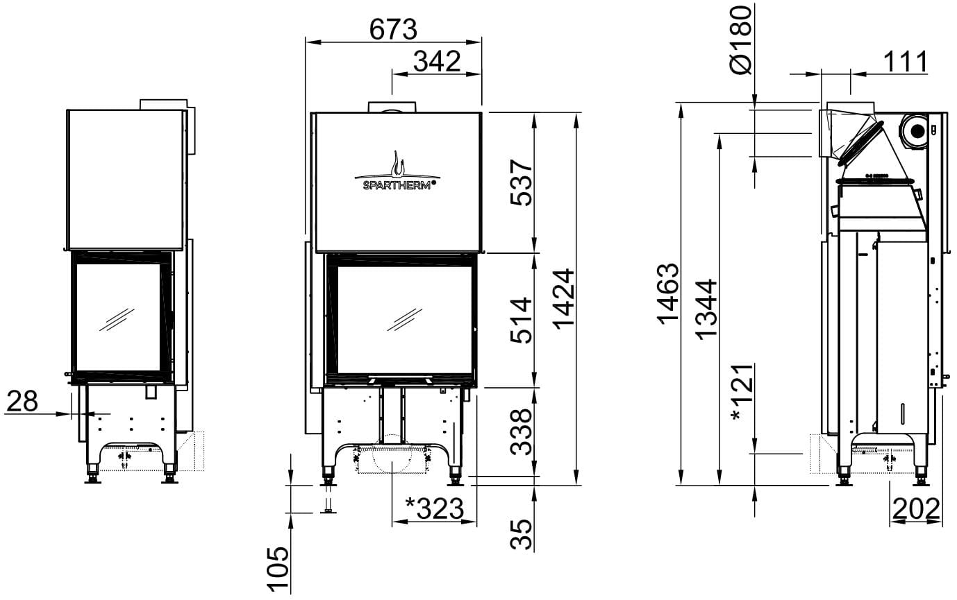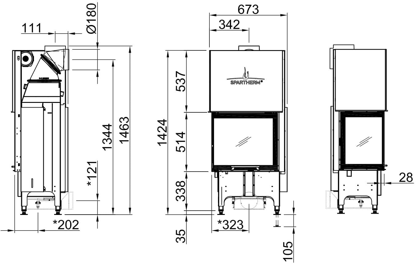 Каминная топка Spartherm Varia 2L-55h/2R-55h (Шпартерм Varia 2L-55h/2R-55h) — это высокоэффективная, современная модель с корпусом из стали. Максимальная мощность равна 9.1 кВт, чего хватает для обогрева помещения в 225 м³. КПД — 80%. У топки два жаропрочных стекла украшенных по периметру шелкографией (отделка Linear 4S). Дверца с подъёмным механизмом. Второе стекло расположена слева (2L-55h) или справа (2R-55h). Ширина дверцы с фронтальной стороны — 584 мм, с боковой — 392 мм, высота — 514 мм.