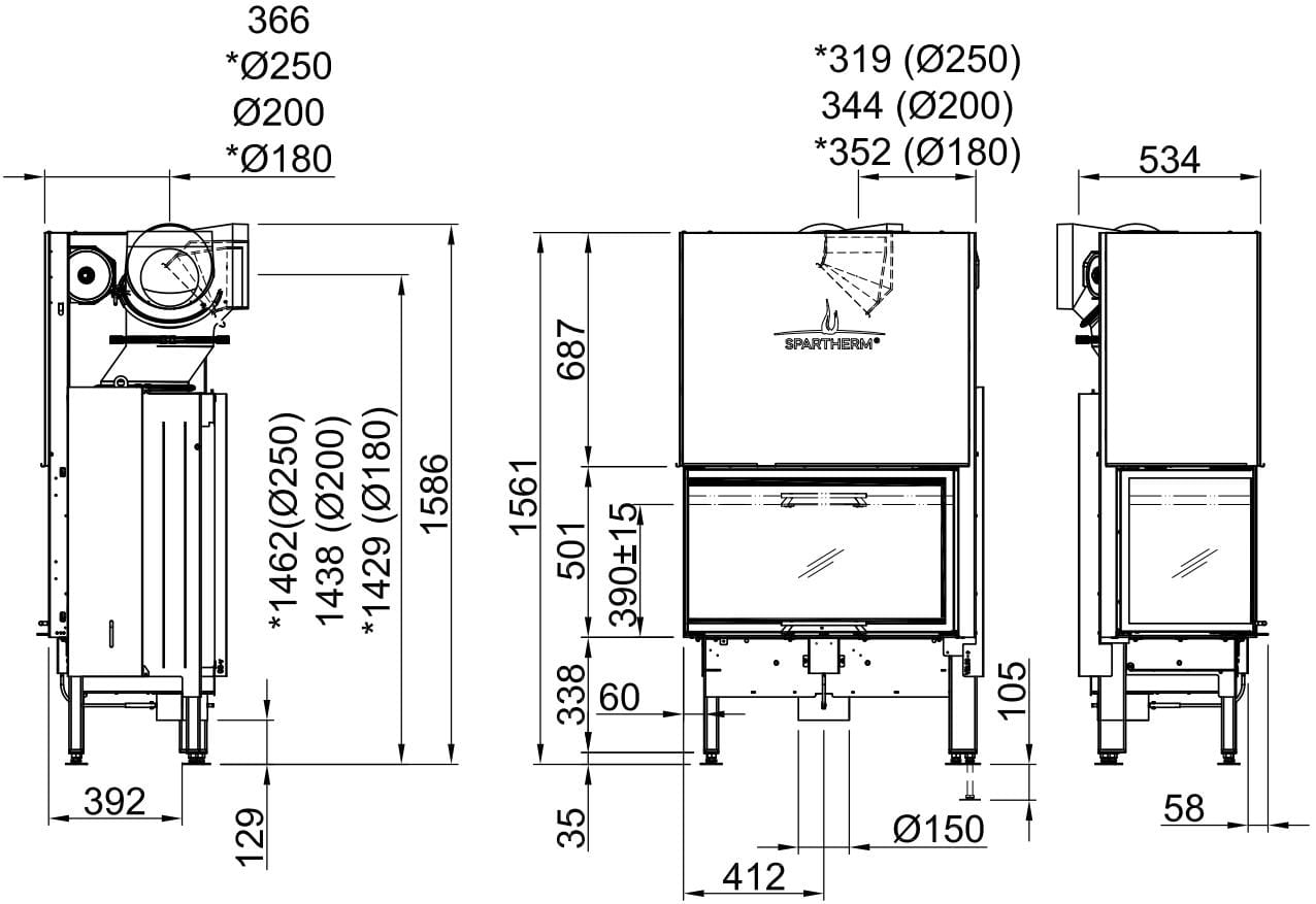 - Varia — максимальное разнообразие форм и размеров: фронтальные модели с подъёмным механизмом или левым/правым открыванием двери; двухсторонние (пристенно-угловые) варианты с обоими способами открывания; трёхсторонние топки с подъёмным механизмом или же модели со сквозным обзором, для встраивания между двумя комнатами. Ширина стекла — до 1200 мм. Макс. мощность в диапазоне 9.1—19.5 кВт.