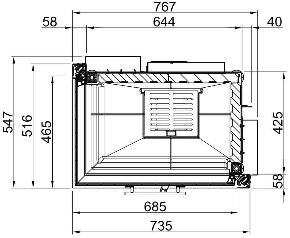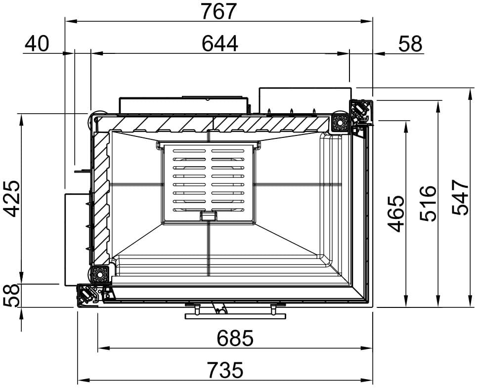 Топочная камера футерована шамотом белого (опционально черного) цвета. Модель оснащена чугунным колосником и зольным ящиком. Топка обладает всеми современными технологиями горения: вторичный дожиг газов и система "Чистое стекло". Очаг с возможностью притока воздуха извне. Для подключения необходим дымоход диаметром 200 мм.