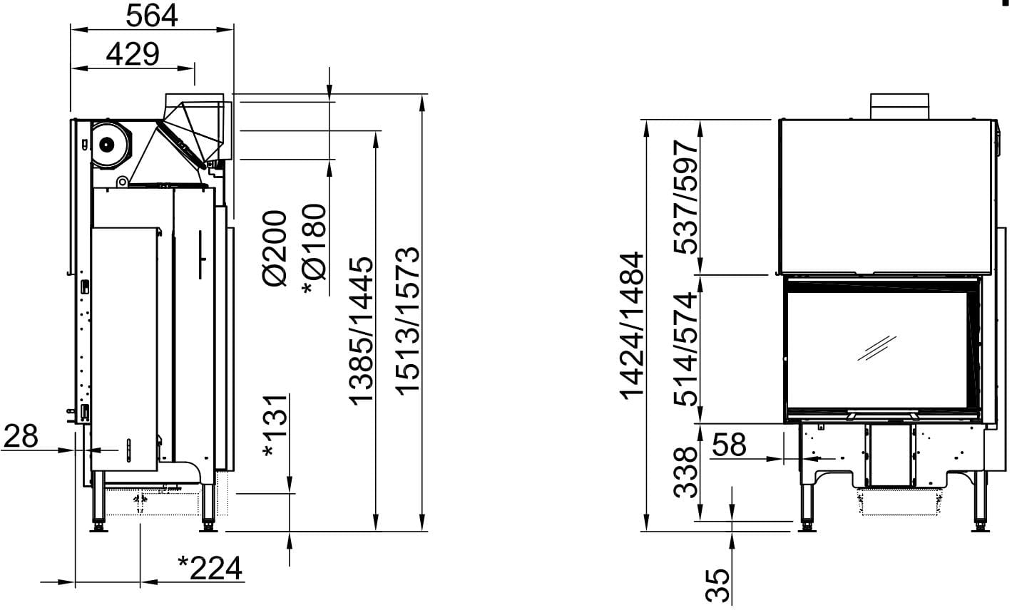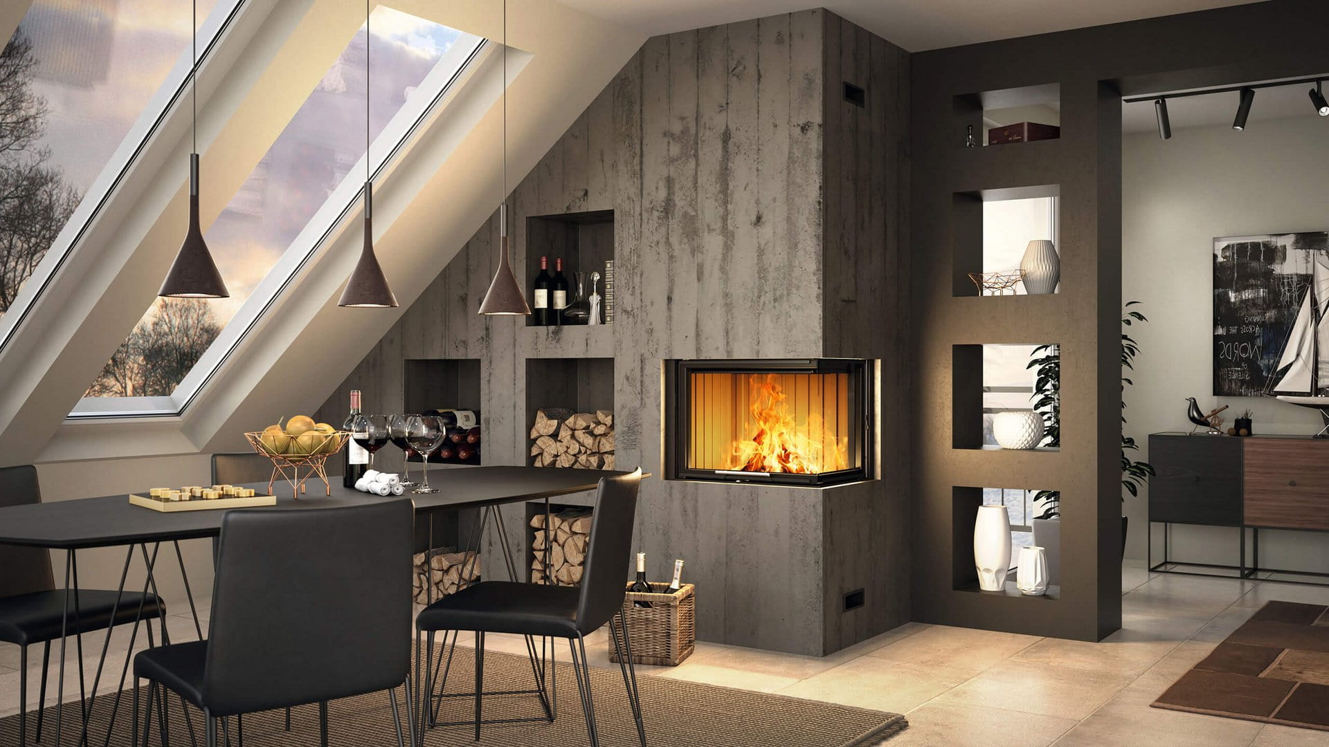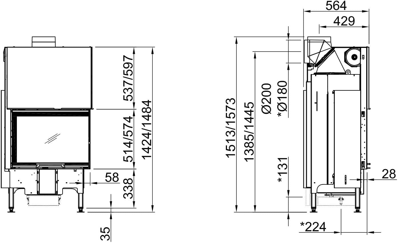 - Varia — максимальное разнообразие форм и размеров: фронтальные модели с подъёмным механизмом или левым/правым открыванием двери; двухсторонние (пристенно-угловые) варианты с обоими способами открывания; трёхсторонние топки с подъёмным механизмом или же модели со сквозным обзором, для встраивания между двумя комнатами. Ширина стекла — до 1200 мм. Макс. мощность в диапазоне 9.1—19.5 кВт.