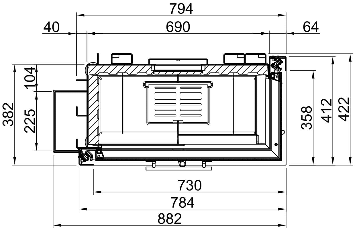Топочная камера футерована шамотом белого (опционально черного) цвета. Модель оснащена чугунным колосником и зольным ящиком. Топка обладает всеми современными технологиями горения: вторичный дожиг газов и система "Чистое стекло". Очаг с возможностью притока воздуха извне. Для подключения необходим дымоход диаметром 200 мм.