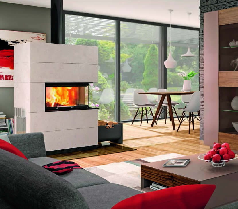 - Varia — максимальное разнообразие форм и размеров: фронтальные модели с подъёмным механизмом или левым/правым открыванием двери; двухсторонние (пристенно-угловые) варианты с обоими способами открывания; трёхсторонние топки с подъёмным механизмом или же модели со сквозным обзором, для встраивания между двумя комнатами. Ширина стекла — до 1200 мм. Макс. мощность в диапазоне 9.1—19.5 кВт.