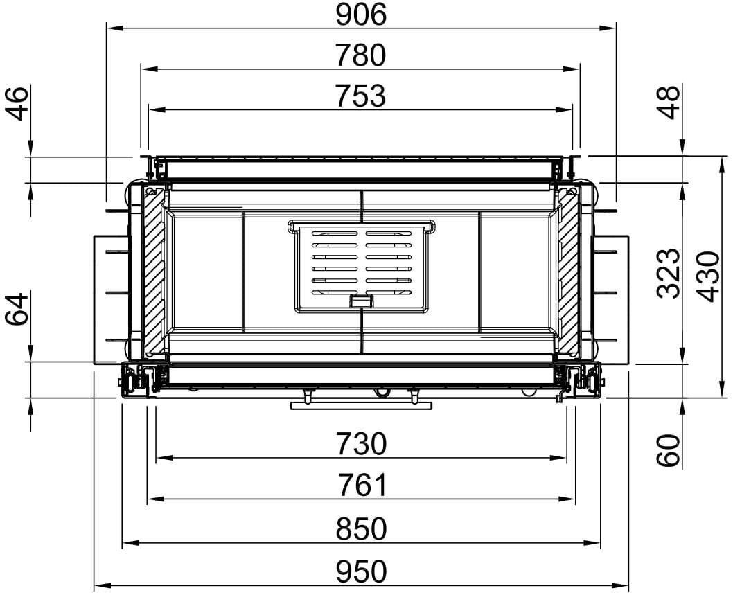 Топочная камера футерована шамотом белого (опционально черного) цвета. Модель оснащена чугунным колосником и зольным ящиком. Топка обладает всеми современными технологиями горения: вторичный дожиг газов и система "Чистое стекло". Очаг с возможностью притока воздуха извне. Для подключения необходим дымоход диаметром 180 мм.