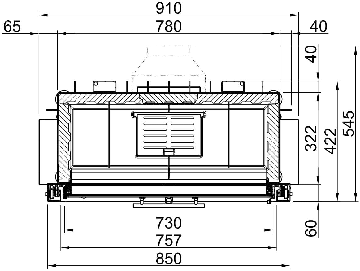 Топочная камера футерована шамотом белого (опционально черного) цвета. Модель оснащена чугунным колосником и зольным ящиком. Топка обладает всеми современными технологиями горения: вторичный дожиг газов и система "Чистое стекло". Очаг с возможностью притока воздуха извне. Для подключения необходим дымоход диаметром 180 мм.