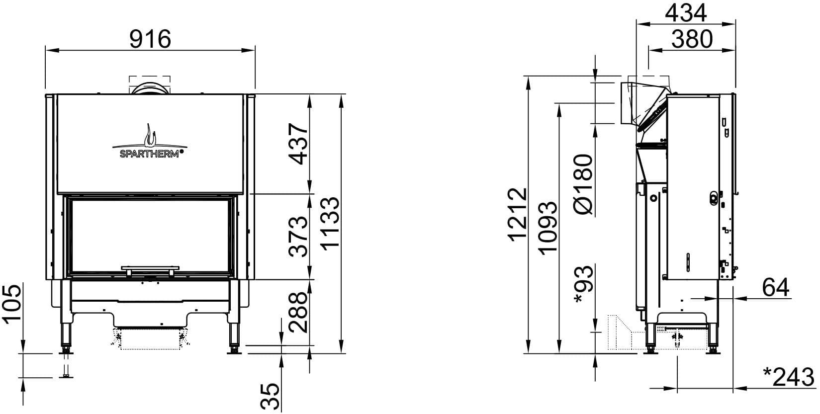 Каминная топка Spartherm Varia ASh (Шпартерм Varia ASh) — это высокоэффективная, современная модель с корпусом из стали. Максимальная мощность равна 9.1 кВт, чего хватает для обогрева помещения в 225 м³. КПД — 80%. У топки прямое жаропрочное стекло, украшенное по периметру шелкографией (отделка Linear 4S). Дверца с подъёмным механизмом. Ширина дверцы — 730 мм, высота — 373 мм.