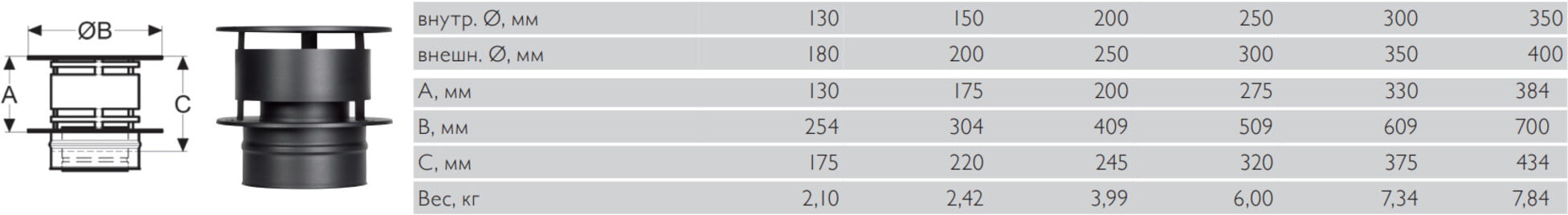 Используется в качестве завершающего звена сэндвич-трубы. Деталь устанавливается на горловину трубы и закрывает теплоизоляцию дымохода, защищает от попадания осадков внутрь системы, а также способствует улучшению тяги благодаря своей форме.