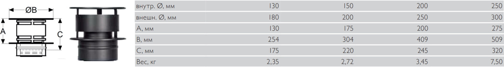Используется в качестве завершающего звена сэндвич-трубы. Деталь устанавливается на горловину трубы и закрывает теплоизоляцию дымохода, защищает от попадания осадков внутрь системы, а также способствует улучшению тяги благодаря своей форме.