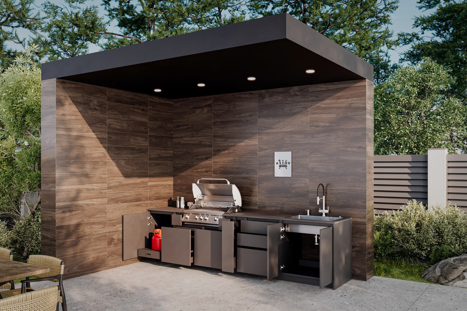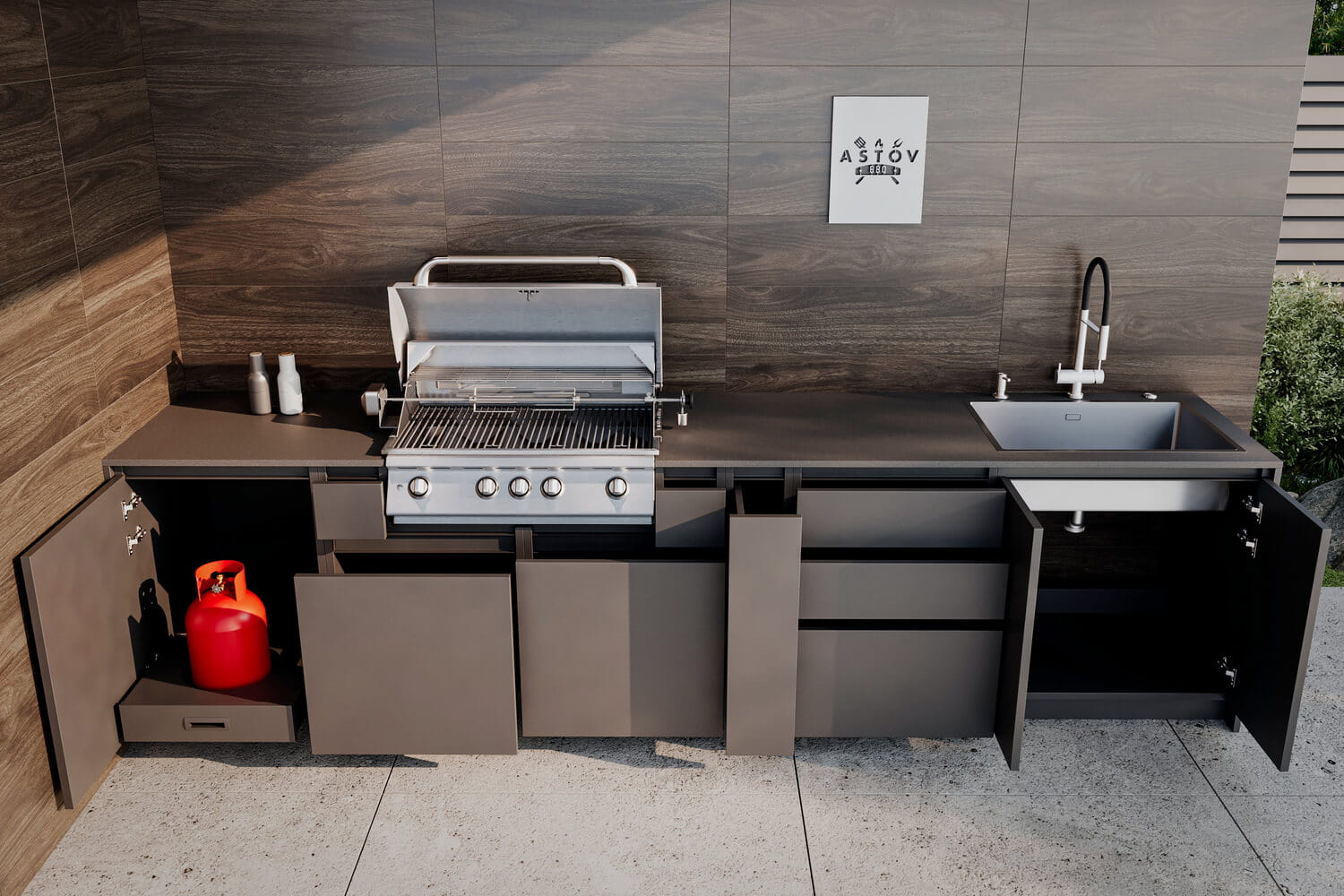 Кухня Астов BBQ № 2 (Кухня Astov BBQ № 2) — полноценная комплектация для тех, кто любит готовку на газовом гриле. Ширина комплекта — 3440 мм.
