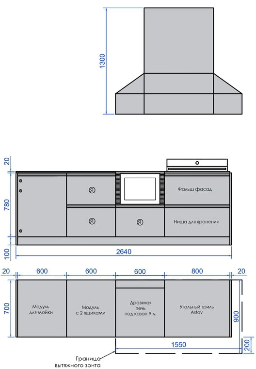 - Вытяжной зонт с подсветкой шириной 1550, глубиной 900 и высотой 1300 мм.