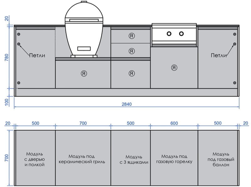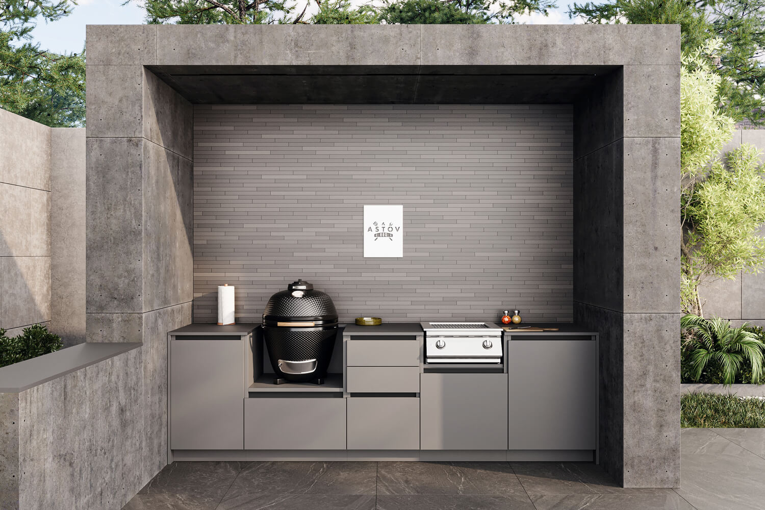 Кухня Астов BBQ № 17 (Кухня Astov BBQ № 17) — универсальная комплектация для тех, кто любит готовку как на натуральном топливе, так и на газу. Комплект предполагает установку керамического гриля, с равномерным распределением тепла по всему продукту и газовой горелки, для быстрого разогрева блюд или готовки с использованием высоких температур. Ширина комплекта — 2840 мм.