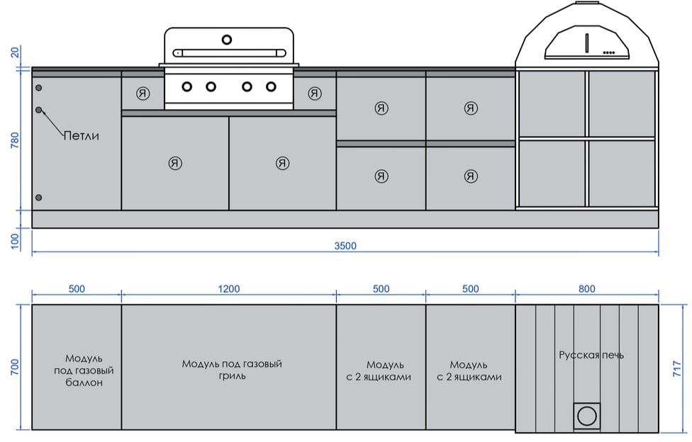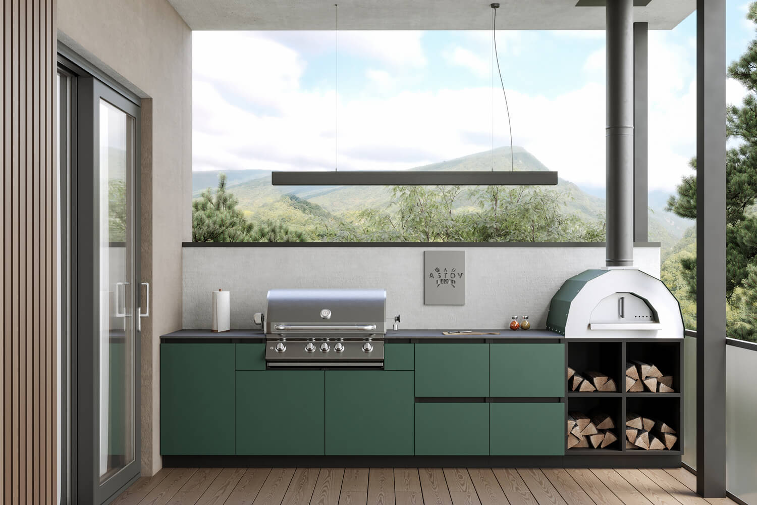 Кухня Астов № BBQ 19 (Кухня Astov BBQ № 19) — комплектация для тех, кто любит готовку на дровах и газу. Газовое устройство позволит быстро и равномерно приготовить мясо, рыбу или овощи с максимальной точностью регулировки температуры, а в печи можно запечь хлеб, приготовить пиццу, пирог или сварить суп. Ширина комплекта — 3500 мм.