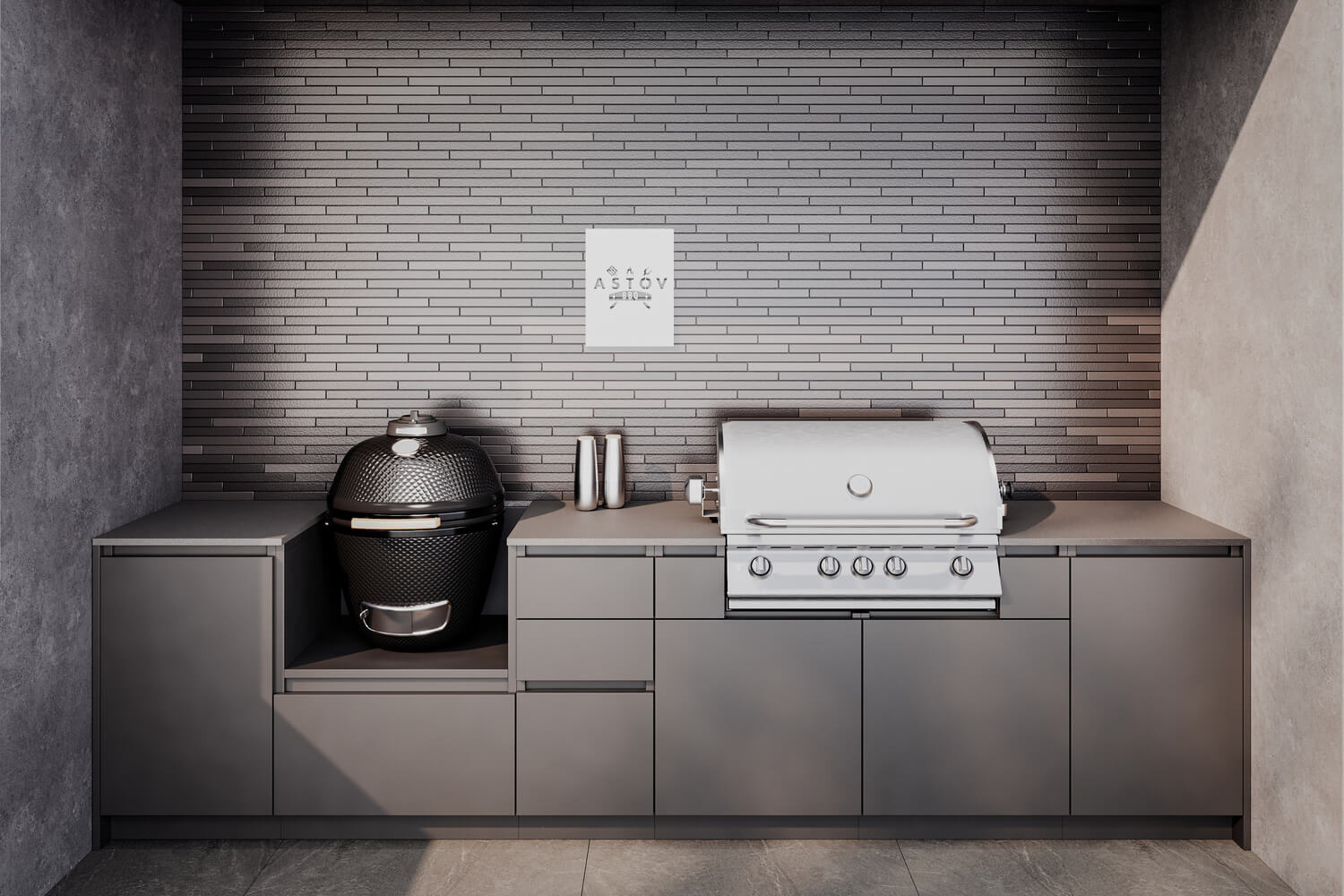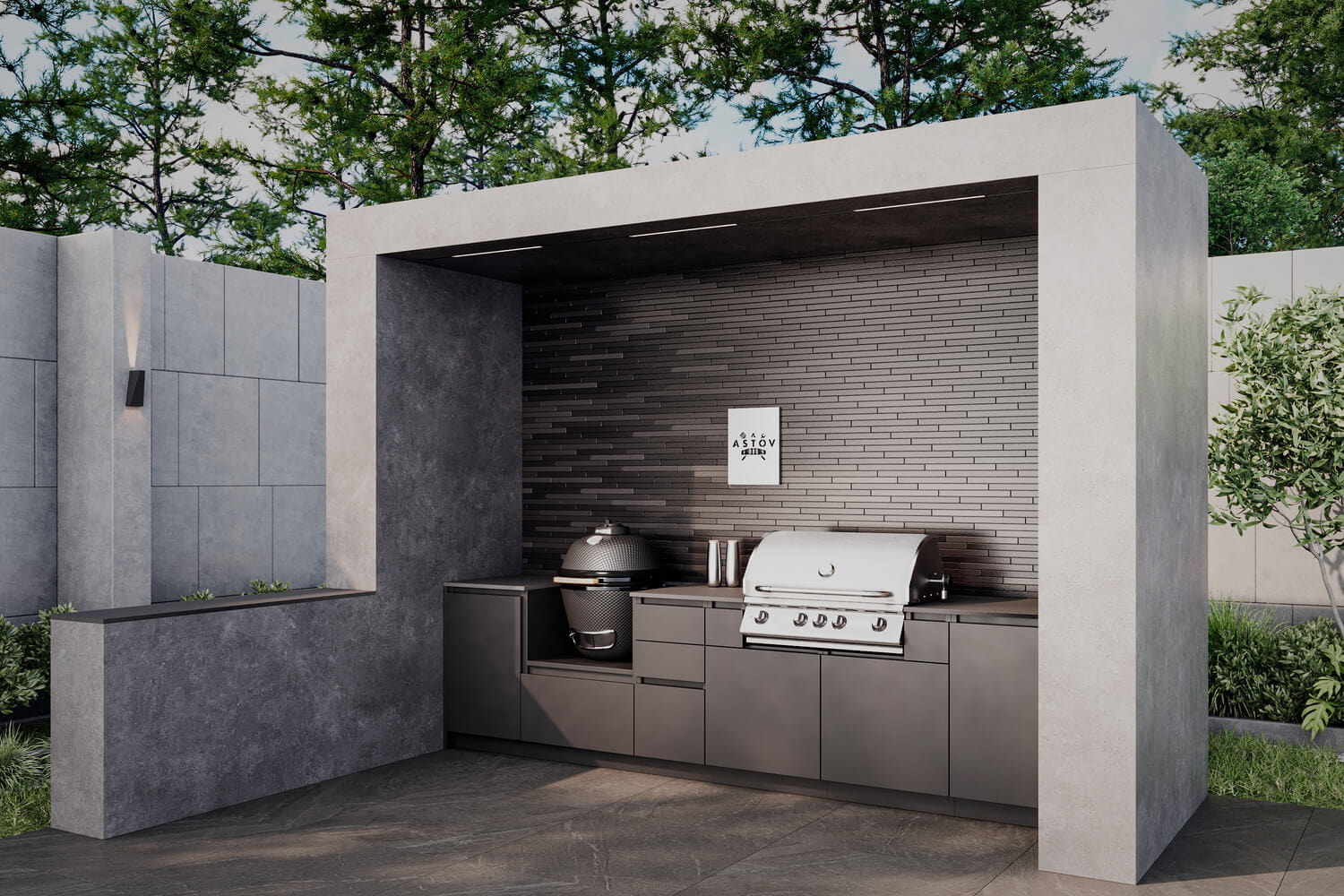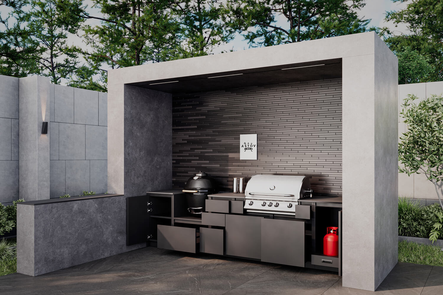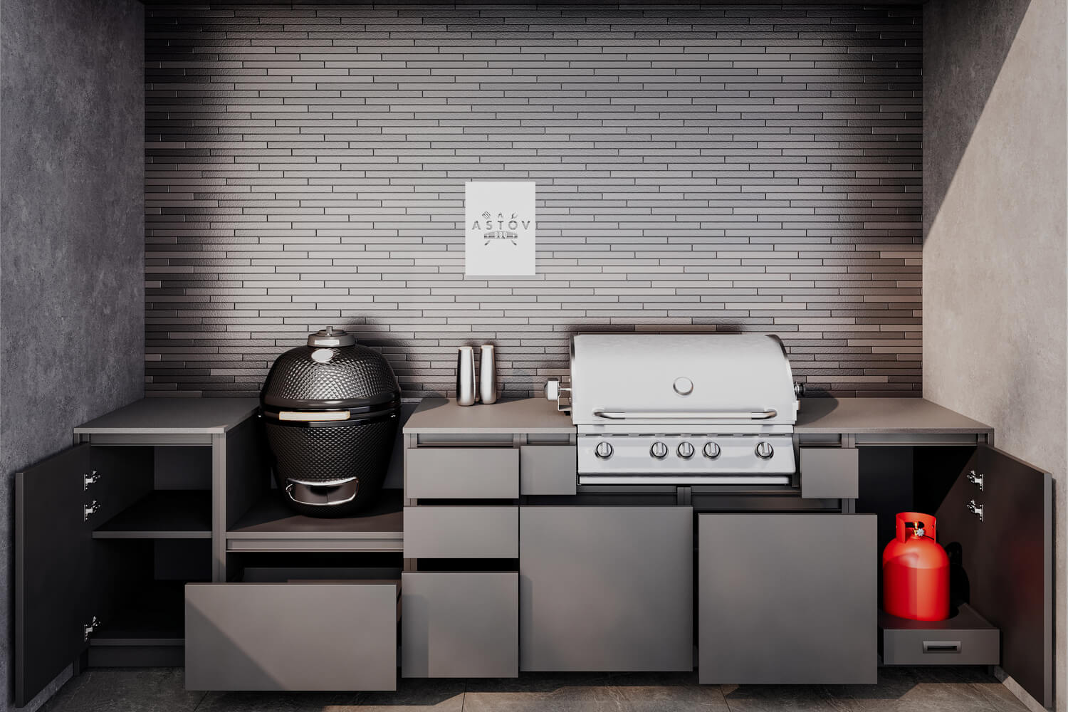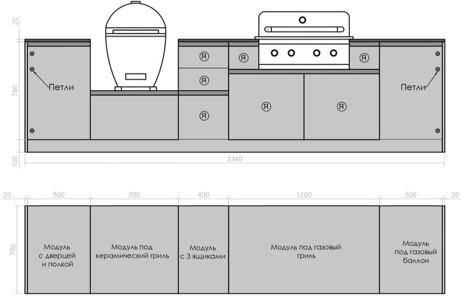 Кухня Астов BBQ № 3 (Кухня Astov BBQ № 3) — комплектация для тех, кто любит готовку как на углях, так и на газовом гриле. Ширина комплекта — 3340 мм.