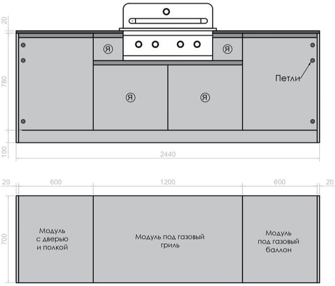 Кухня Астов BBQ № 6 (Кухня Astov BBQ № 6) — небольшая комплектация для тех, кто любит готовку на газовом гриле. Ширина комплекта — 2440 мм.