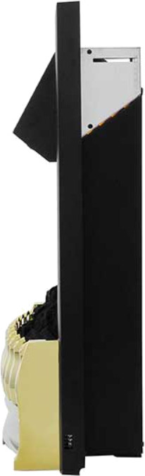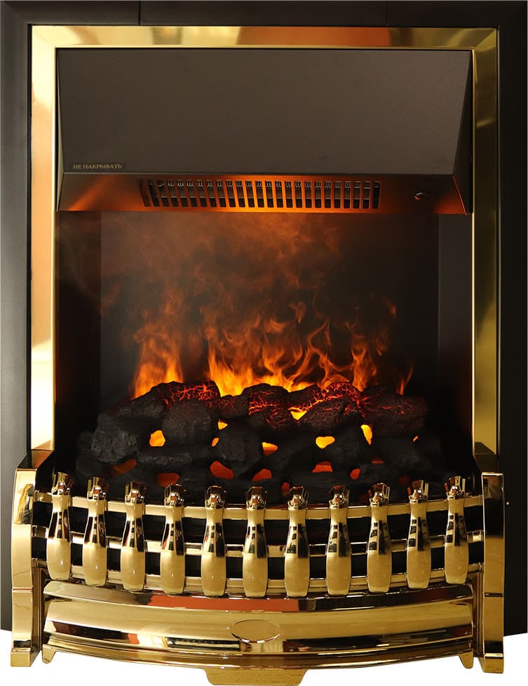 Корпус изделия окрашен в черный цвет с элементами декора под золото. Классические поленья заменены на угли с имитацией тления.