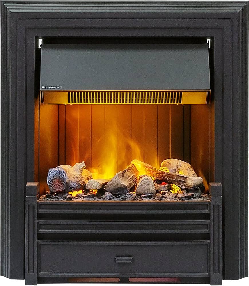 Корпус изделия имеет лаконичный дизайн с прямыми и четкими линиями, окрашен в черный цвет. Внутри очага размещен муляж поленьев.