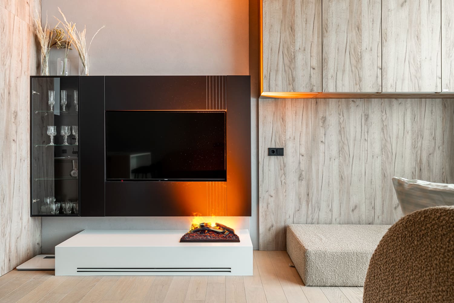 Для его монтажа не нужны дымоход, усиление пола или специальные разрешения. Его можно устанавливать рядом с телевизором и другой бытовой техникой, достаточно наличия свободной розетки. Устройство абсолютно безопасно, так как отсутствует какое-либо горение. Данная модель поставляется с декоративными элементами.