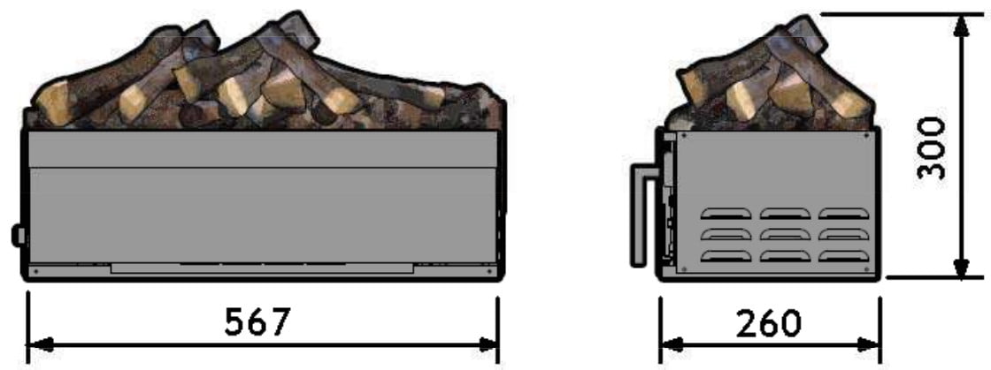 Изделие окрашено в черный цвет и имеет открытый со всех сторон обзор на пламя. Отсутствие стенок позволит установить камин в любом выбраном месте, более выгодно обыграв его в интерьере. Сверху очага размещен муляж поленьев с эффектом тления.