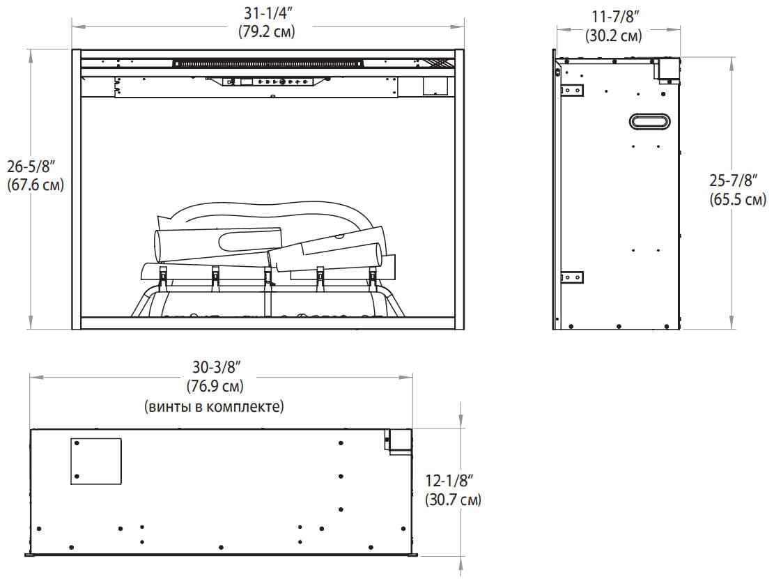 Очаги оснащены топочной решеткой с муляжом дров в натуральную величину. Модели могут устанавливаться отдельно или встраиваться в портал. Во втором случае зона топки декорирована под кирпичную кладку «елочка» со следами искусственной копоти и сажи.