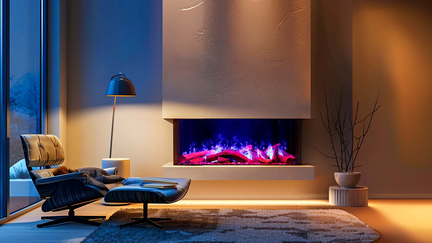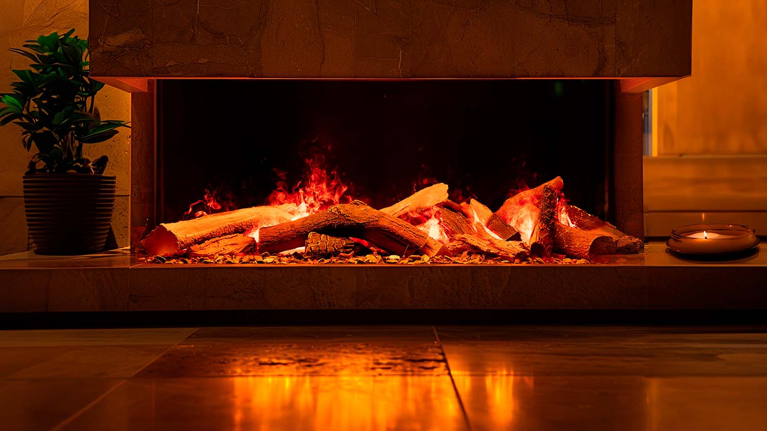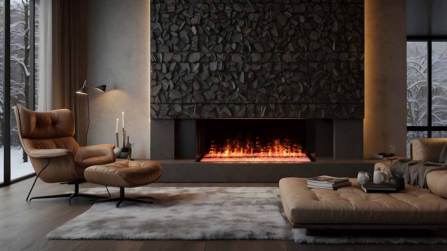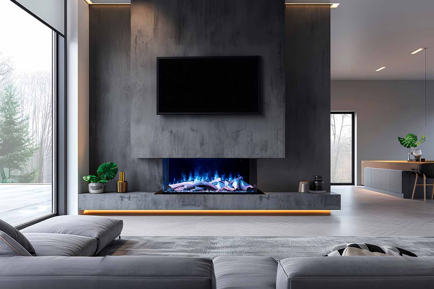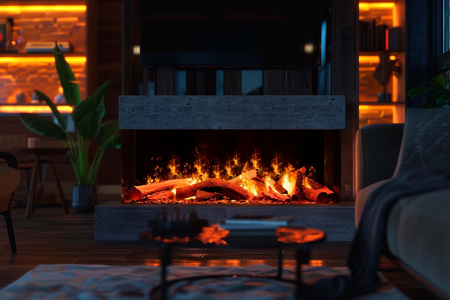 Конструкция очагов предполагает их установку в ниши или межкомнатные перегородки — все зависит от конфигурации выбранного устройства: линейные модели с шириной фронтального стекла более 2 метров, широкие камины, а также вертикальные или угловые.