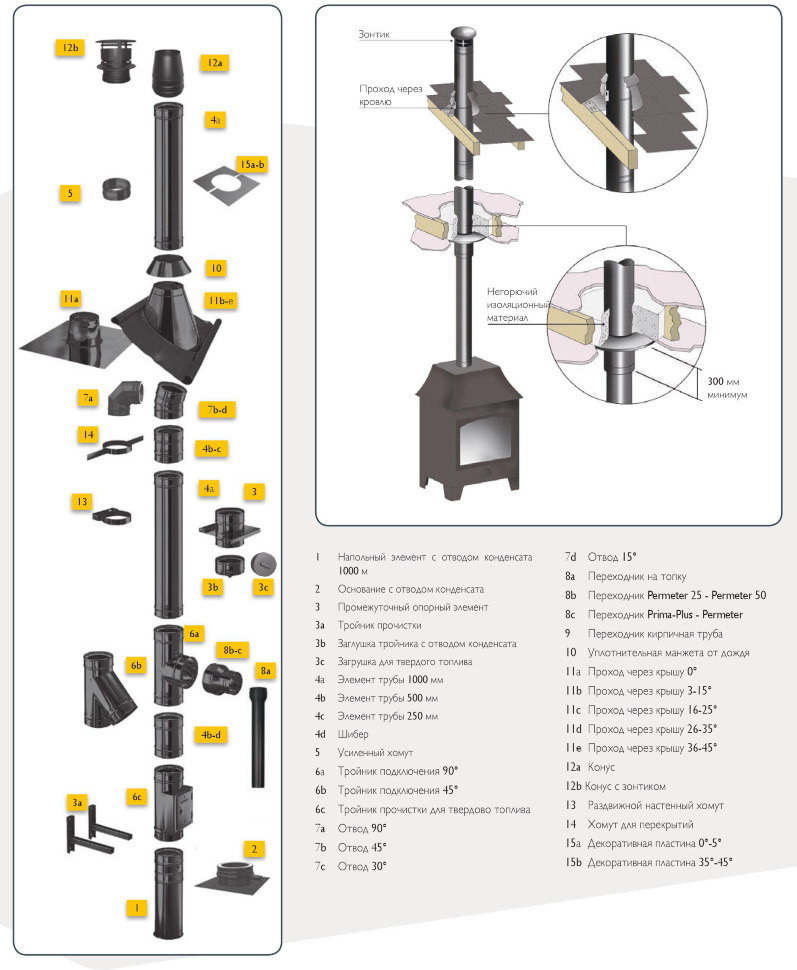 Рабочая температура двухконтурных дымоходов составляет 600 °C, при этом они способны выдерживать нагрев до 1100 °C, сохраняя стабильность изоляционного слоя. Стоит отметить, что система Permeter белого цвета применяется к отопительным агрегатам с температурой дымовых газов, не превышающей 400 °C на выходе. В качестве топлива допустимо использование дров, пеллетов или газа.