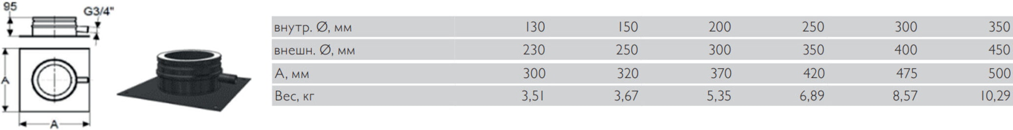Используется при напольном способе крепления конструкции дымоходного канала в качестве нижней опоры. Оборудован носиком для отвода конденсата.