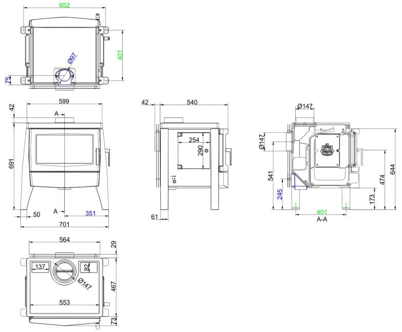 В конструкции предусмотрена дополнительная боковая дверь, облегчающая загрузку топлива Она может располагаться с левой или с правой стороны. Дымоход диаметром 150 мм подключается сверху или сзади.