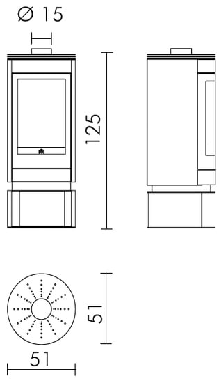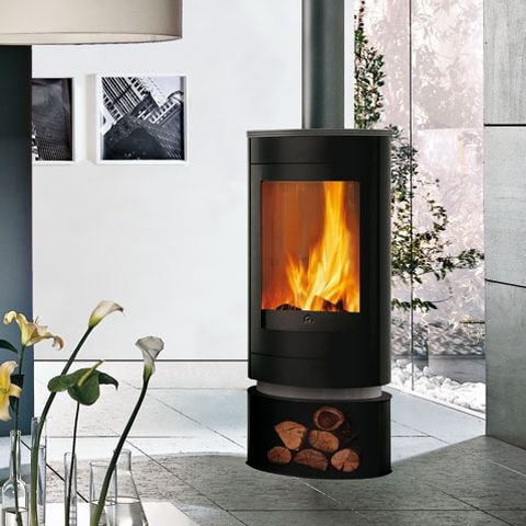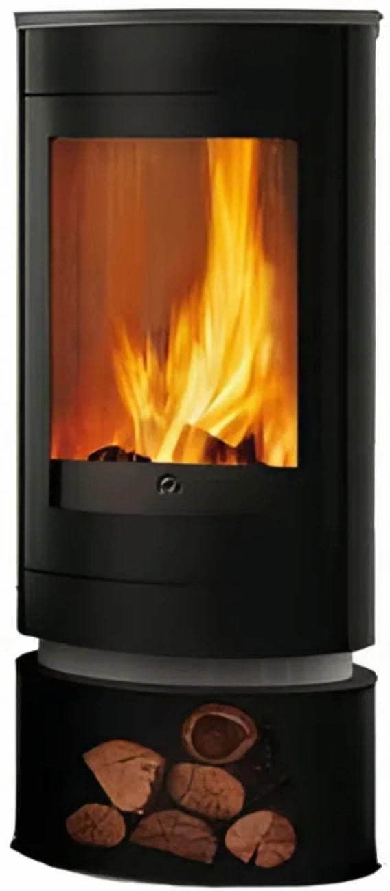Печь можно разместить как у стены, так и ближе к центру комнаты. Большое панорамное стекло позволит наслаждаться красотой горения. Футеровкой топочной камеры выступает огнеупорный материал. Внизу размещен удобный открытый дровник. Дымоход диаметром 150 мм подключается сверху.