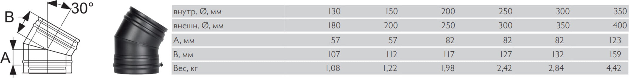 Используется для изменения направления дымохода с наклоном в 30°, что поможет обойти препятствия в перекрытиях при монтаже вертикальной конструкции. При установке отвода 30° расстояние по осям дымохода не должно превышать 1 метра.