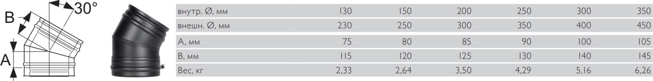 Используется для изменения направления дымохода с наклоном в 30°, что поможет обойти препятствия в перекрытиях при монтаже вертикальной конструкции. При установке отвода 30° расстояние по осям дымохода не должно превышать 1 метра.