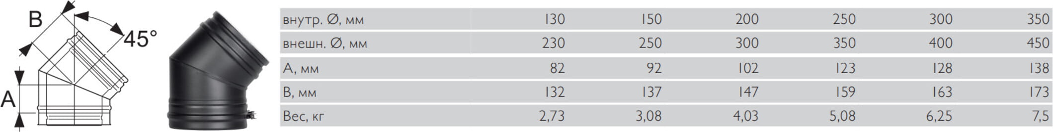 Используется для изменения направления дымохода с наклоном в 45°, что поможет обойти препятствия в перекрытиях при монтаже вертикальной конструкции. При установке отвода 45° расстояние по осям дымохода не должно превышать 40 см. В сочетании с тройником аналогичного угла, отвод позволяет соединить горизонтальный участок с вертикальным дымоходом.