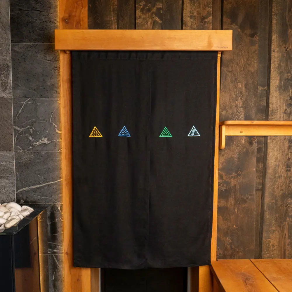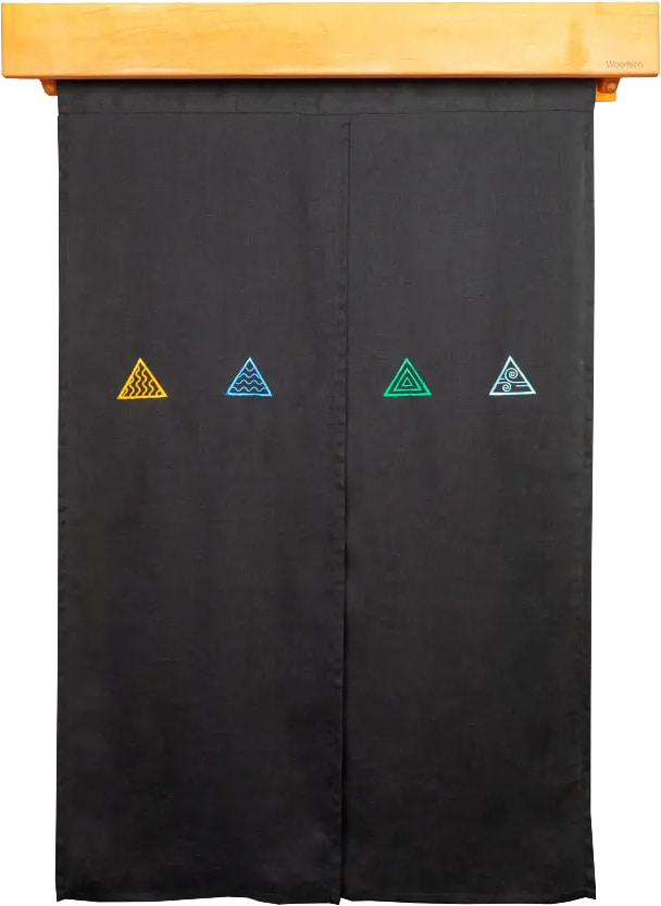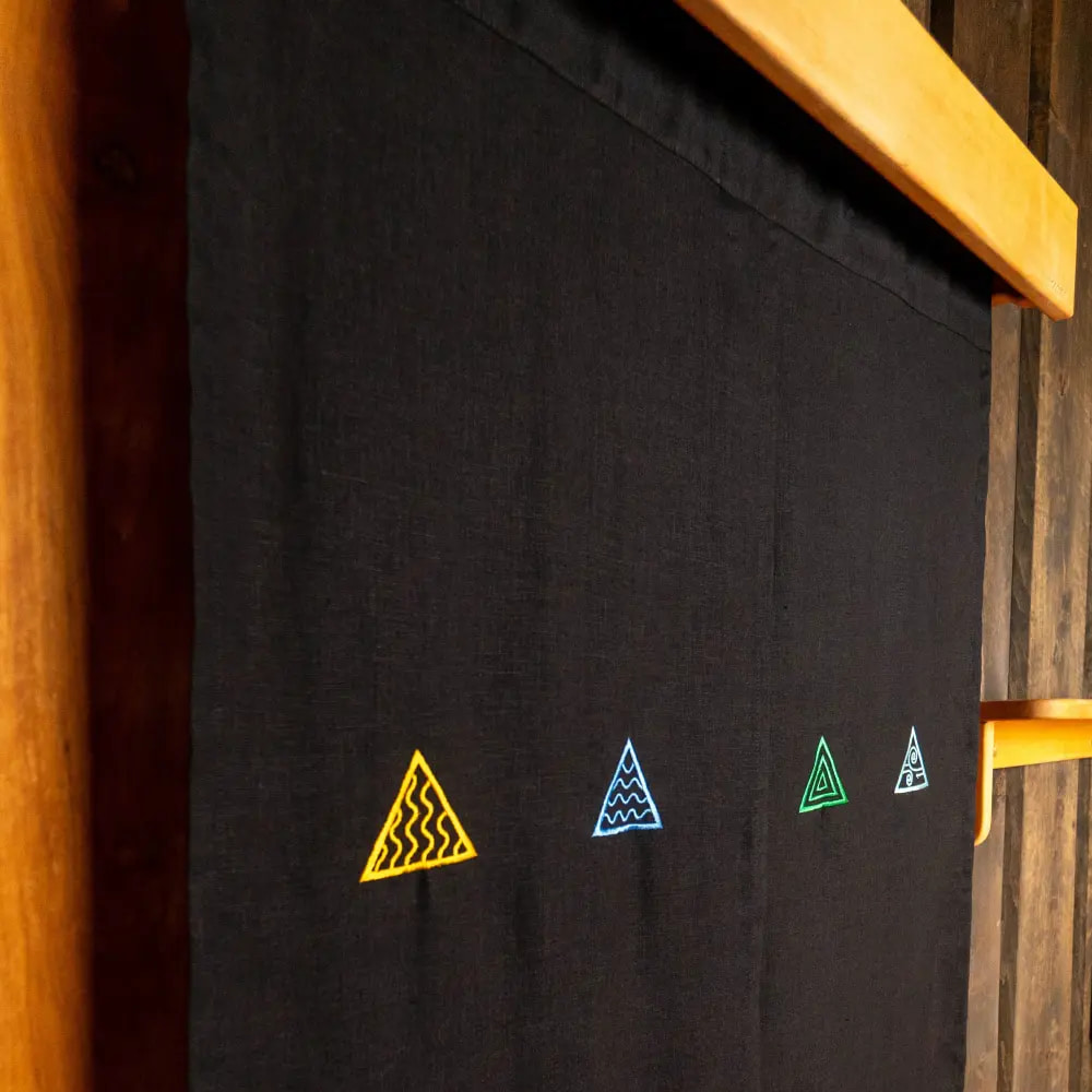 Ткань, выполненная из натурального льна черного цвета, украшена орнаментом природных стихий, вращающаяся ручка — из ольхи. Длина ткани составляет 1200 мм.