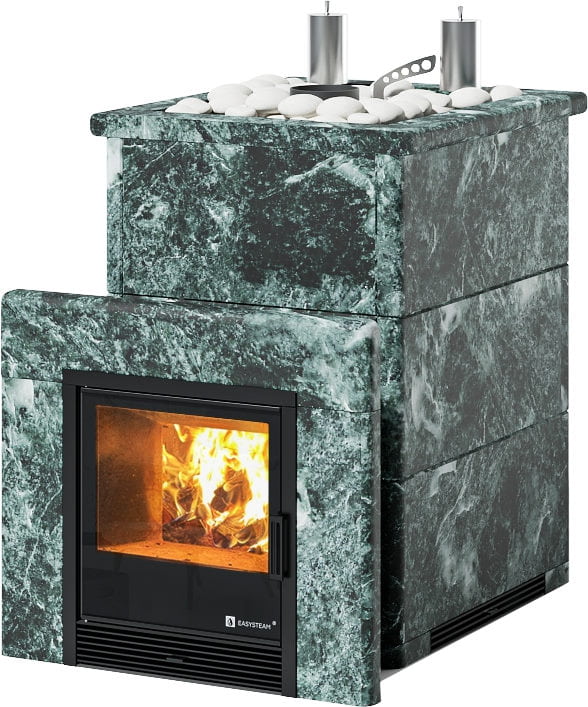 С терморегулирующей задвижкой, позволяющей максимально рационально использовать тепловую энергию и разогревать камни до температур 550-650 °C.