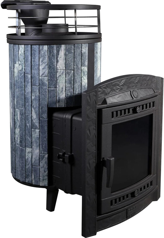Подача воздуха для горения разделена на верхнее и подовое. Также доступ воздуха обеспечивает и колосниковая решетка. Вода внутрь закрытой каменки подается через специальную воронку пушки, дозировано попадая на раскаленные камни, образуя пар, который выходит через второе отверстие горловины. Открытая каменка может быть выполнена в разном стиле: облицовка из ламелей, натурального камня, сетки или комбинированный вариант.