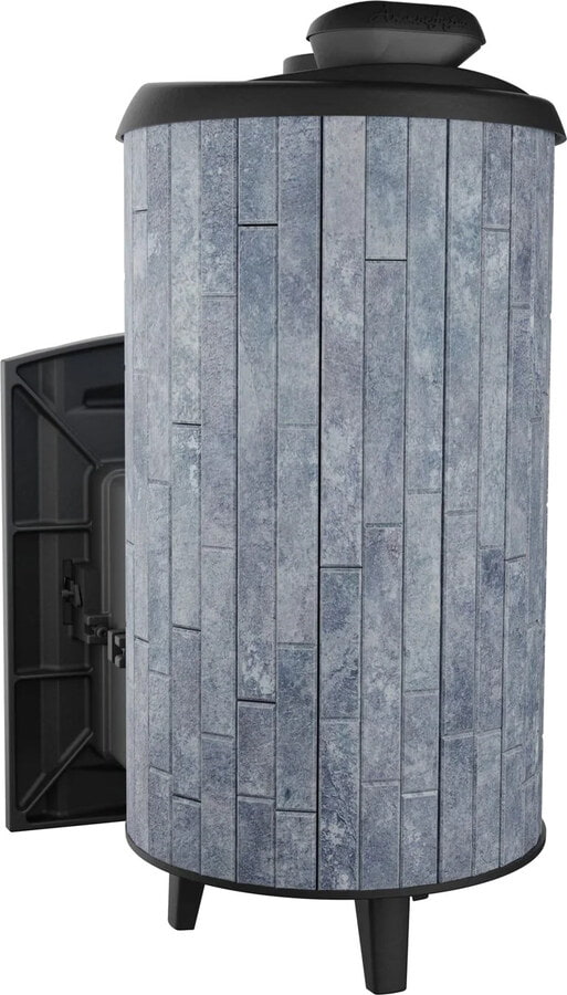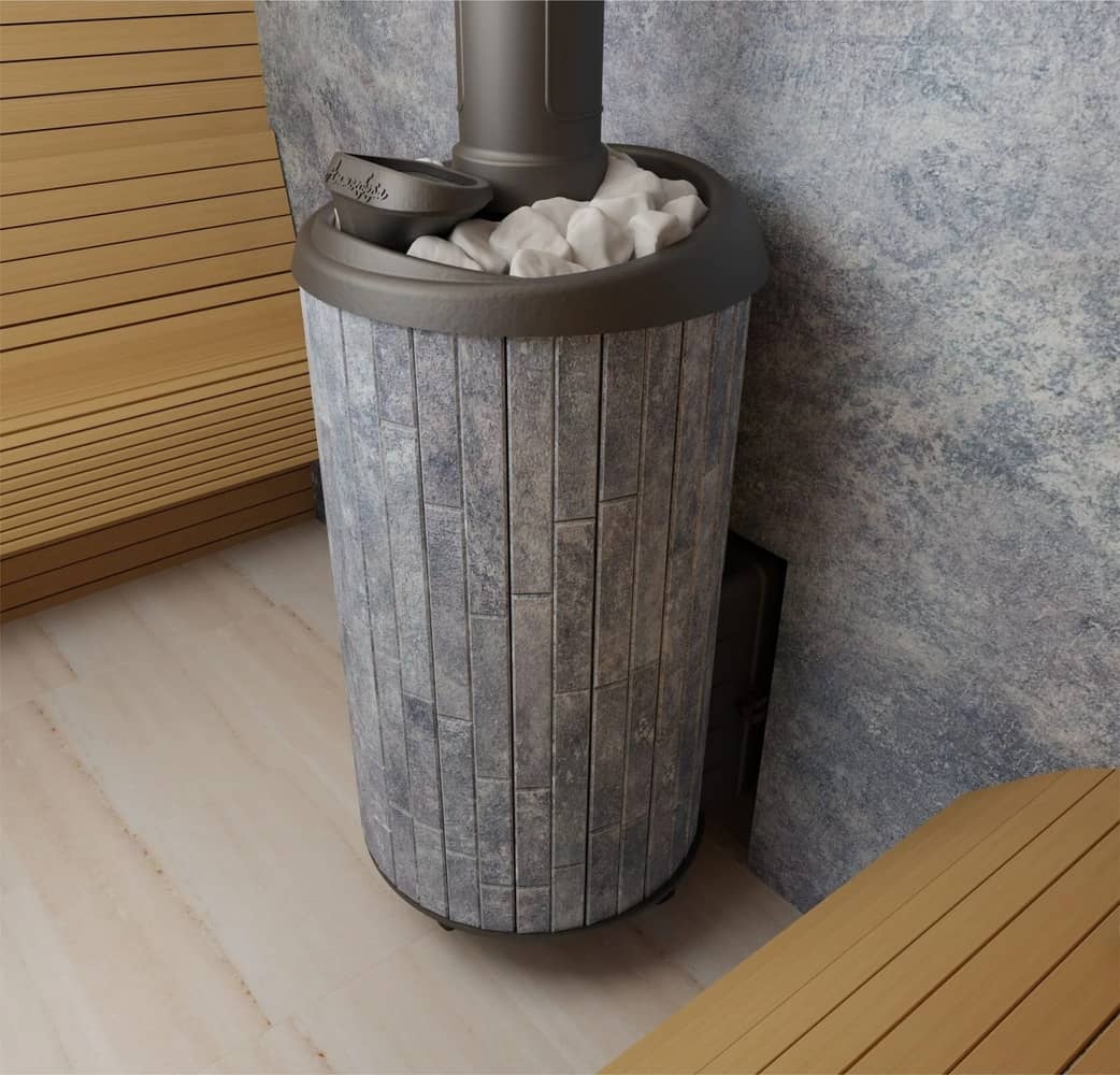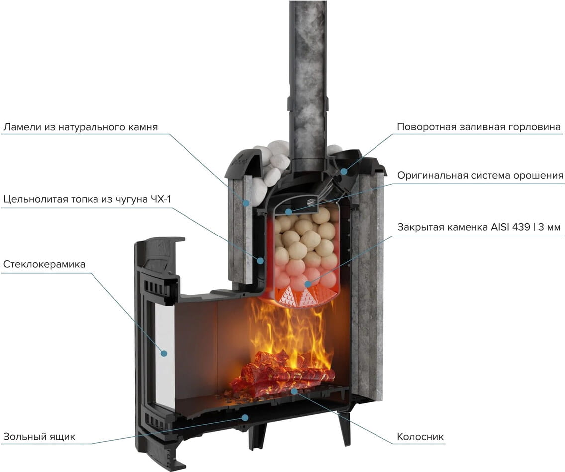 Подача воздуха для горения разделена на верхнее и подовое. Также доступ воздуха обеспечивает и колосниковая решетка. Вода внутрь закрытой каменки подается через специальную воронку пушки, дозировано попадая на раскаленные камни, образуя пар, который выходит через второе отверстие горловины. Открытая каменка может быть выполнена в разном стиле: облицовка из ламелей, натурального камня, сетки или комбинированный вариант.