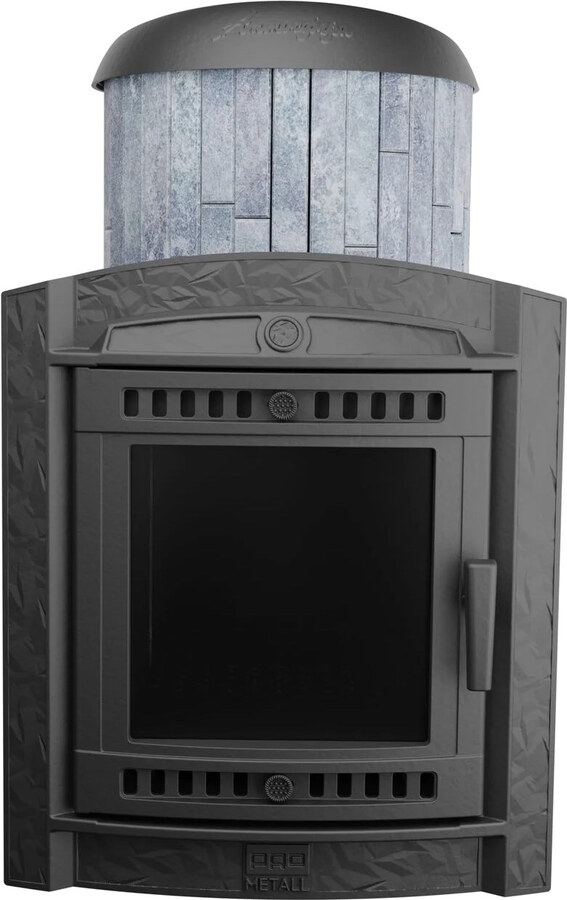 Атмосфера XL - дровяная печь для бани с парильным отделением объемом до 26 м3. Печь изготовлена из чугуна ЧХ-1. Закрытая каменка вмещает до 40 кг камней. Кожух из ламелей натурального камня защищает от жесткого инфракрасного излучения, хорошо накапливает и держит тепло. Обслуживание топочного пространства происходит из смежного с парилкой помещения.