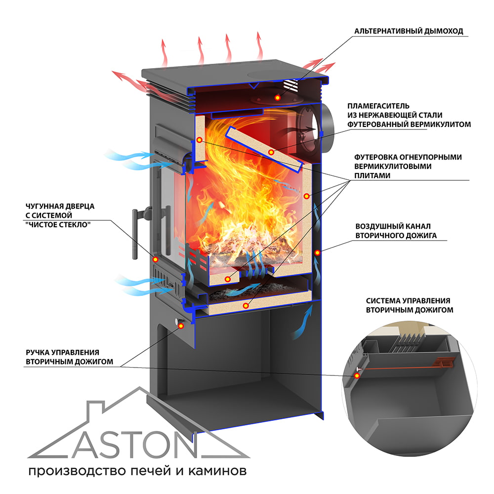 Приборы отопления от Aston (печи-камины, отопительные печи) выполнены из котловой 3-4 мм стали 09Г2С. В топочных камерах печей для улучшения тепловых показателей используется футеровка из шамотных или вермикулитовых плит. В дверях печей используется керамическое стекло SСHOTT ROBAX. Оно способно выдержать температуру до 650 градусов цельсия. Все печи снабжены современными системами — вторичный дожиг газов и "Чистое стекло".