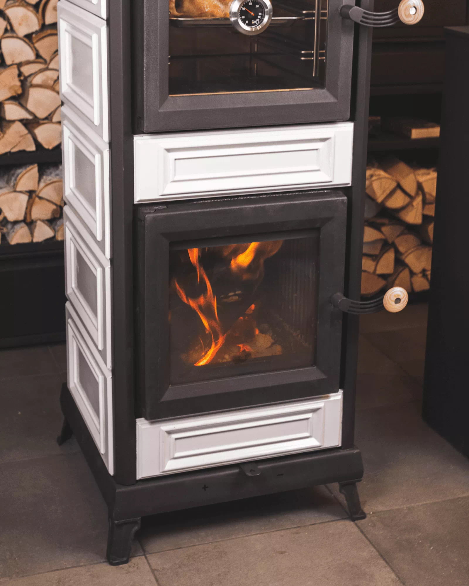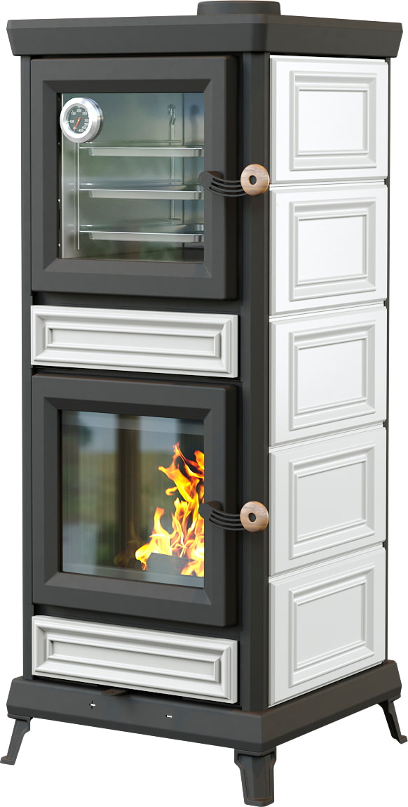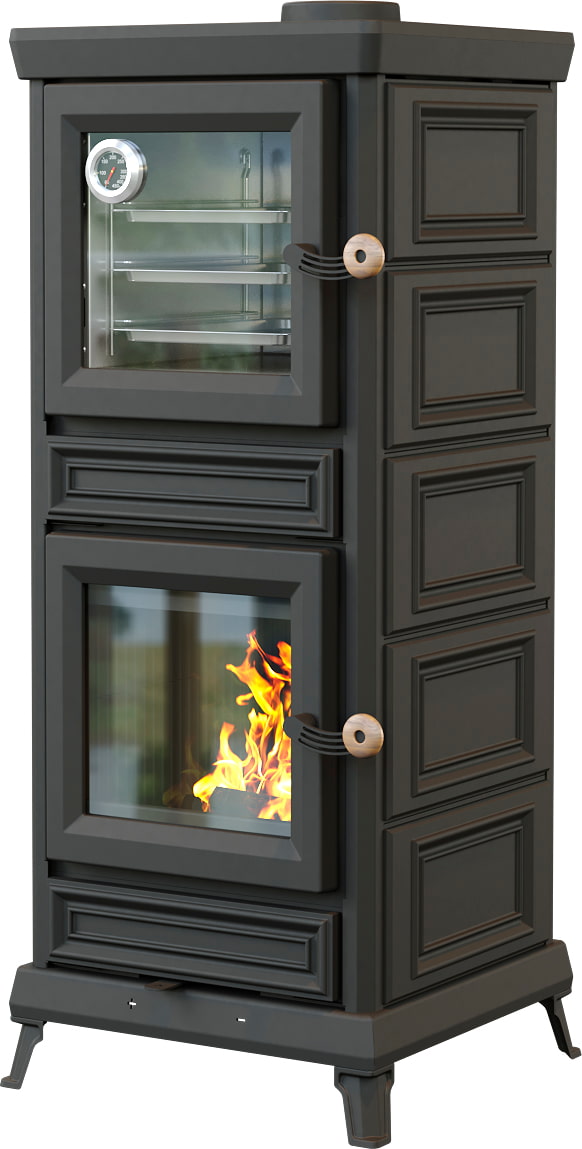 Камин прямоугольной формы, лучшее расположение — у стены. Топочная камера футерована вермикулитом или чугунными панелями, на дне — колосник с выемным зольным ящиком. Печь снабжена чугунной варочной поверхностью и духовкой из нержавеющей стали для приготовления пищи или напитков. Дымоход диаметром 150 мм подключается сверху.