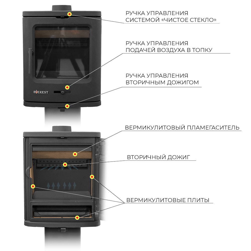 Все печи Эверест выполнены из европейского чугуна, но согласно ГОСТу 1412-85. Также из чугуна выполнена и топочные камера. В дверях печей используется керамическое стекло SСHOTT ROBAX. Оно способно выдержать температуру до 650 градусов цельсия. Все печи снабжены современными системами — вторичный дожиг газов и "Чистое стекло".