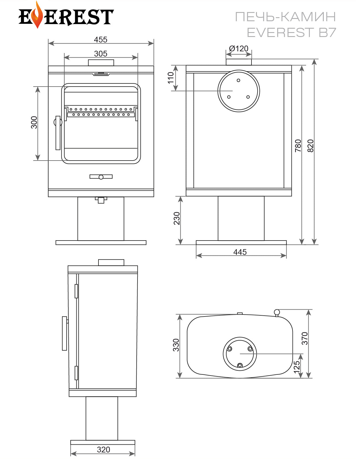 PDF Инструкция на печи-камины Эверест (481.62KB)PDF Технический лист Печи-камины Эверест B7, B7K, B7M (2026 г.) (1.56MB)