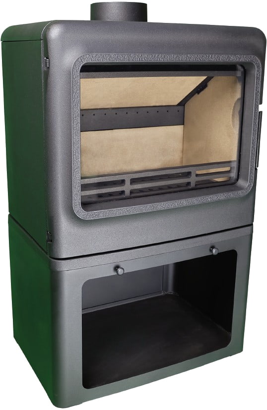 У печи есть вторичный дожиг газов, система "Чистое стекло" и возможность подключения притока воздуха извне. Прямое большое стекло даёт отличный обзор на горение. Футеровка топки из вермикулита. Дымоход 150 мм подключается сверху или сзади.