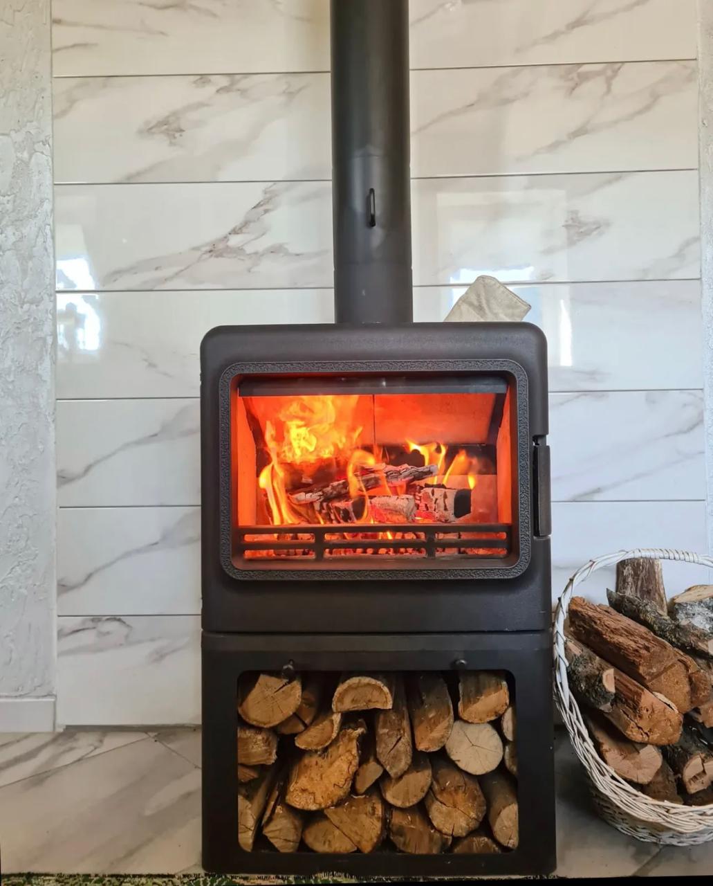Полностью чугунная печь-камин FireBird Leopard с дровником (ФаерБерд Леопард с дровником) обладает мощностью 9 кВт, способна обогреть помещение в 225 м³. КПД печи — 81%. Очаг прямоугольной формы с закругленными углами корпуса, основание в виде дровника.