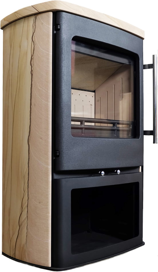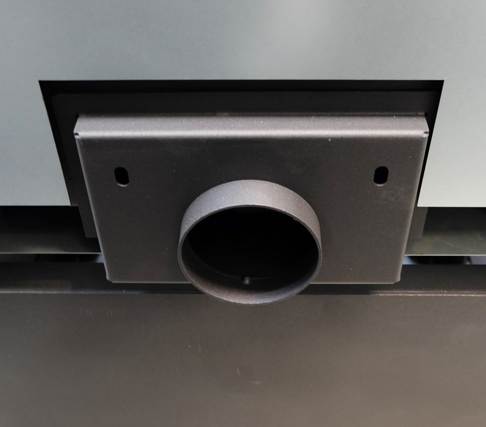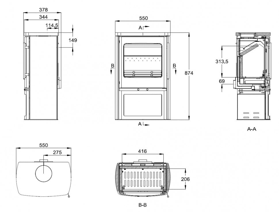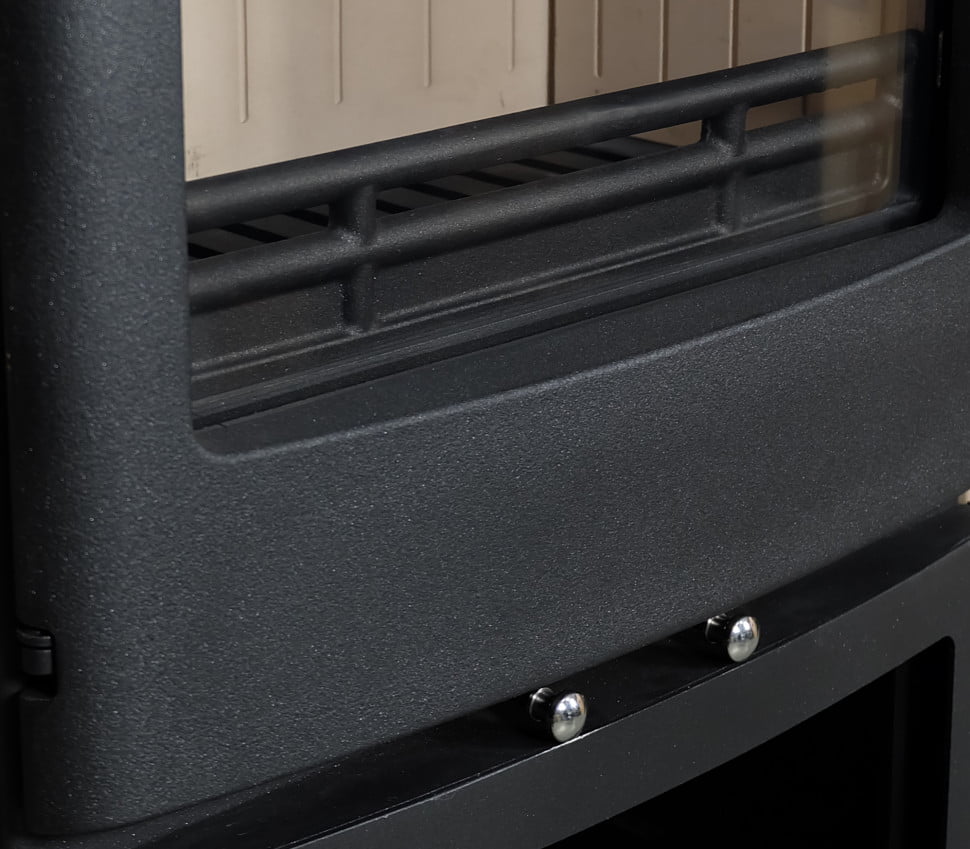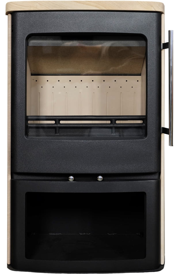 Модель снабжена всеми современными технологиями горения: вторичный дожиг газов, система "Чистое стекло" и возможность подключения притока воздуха извне. Большое прямое стекло даёт отличный обзор на горение. Футеровка топки выполнена из шамотно-керамических панелей. В нижней части печи предусмотрена ниша для хранения небольшого запаса дров. Дымоход диаметром 130 мм подключается сверху или сзади.