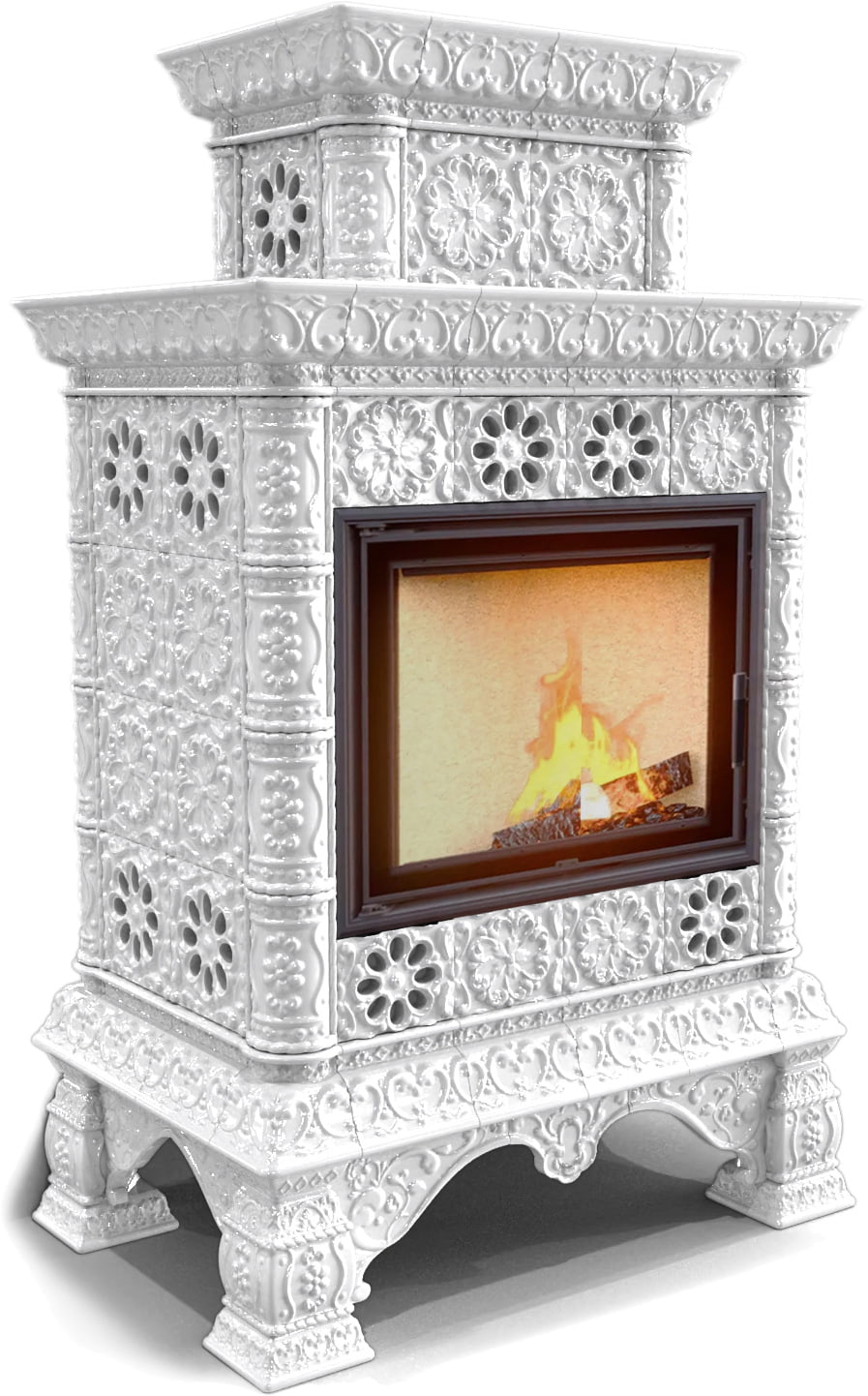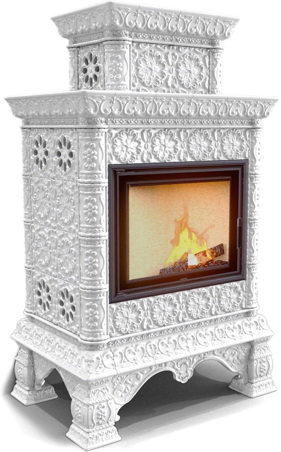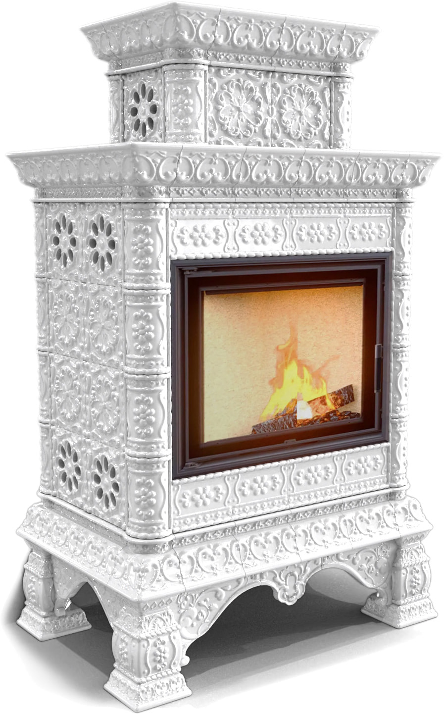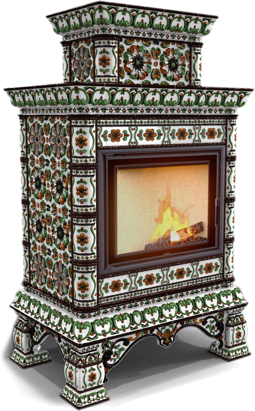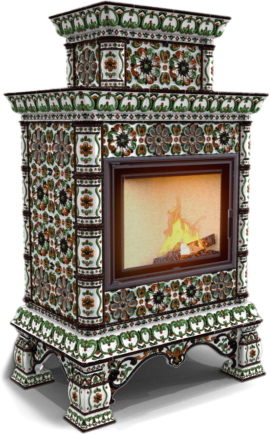 Облицовка легко собирается на металлический конструктив и может состоять из нескольких блоков, скрепляемых между собой винтами. Помимо этого, она разделяет модельный ряд на печи с пристенным, центральным и угловым расположением. Для придания камину и дымоходной трубе единого стиля Вы можете приобрести керамический кожух для внутри-домовой части дымохода (однослойных труб), диаметром до 150-200 мм. Кожух тоже может быть однотонным или с росписью в тон печи.