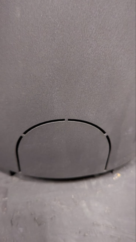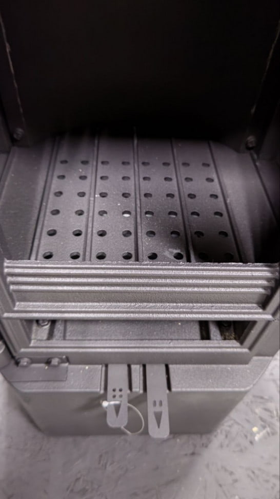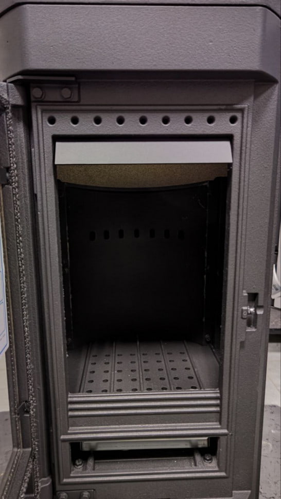 На дне топки есть колосник с расположенным под ним зольным ящиком. Ручка перфорированная, что обезопасит от ожога при открывании дверцы. Возможные неровности пола компенсируются регулируемыми ножками. Дымоход диаметром 130 мм подключается сверху.
