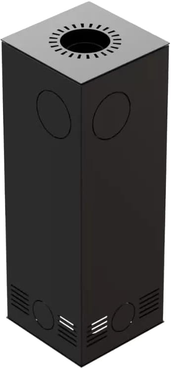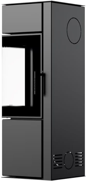Форма печи — вертикальный прямоугольник. На дне топки есть колосник с расположенным под ним зольным ящиком. Стенки топочной камеры футерованы термоустойчивым материалом Termotec (Термотек) белого цвета. Нижнюю часть устройства можно использовать в качестве дровника. Для отвода продуктов сгорания необходим дымоход диаметром 150 мм, который подключается сверху или сзади.
