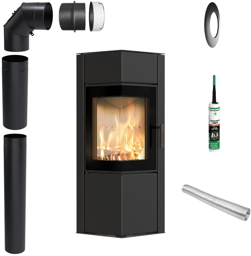 Остекление может быть прямым, угловым (два стекла), п-образным (три стекла) или панорамным (изогнутое). Стекло выполнено из жаростойкой керамики, выдерживающей температуру до 660 °C, копоть практически не оседает благодаря системе «Чистое стекло».
