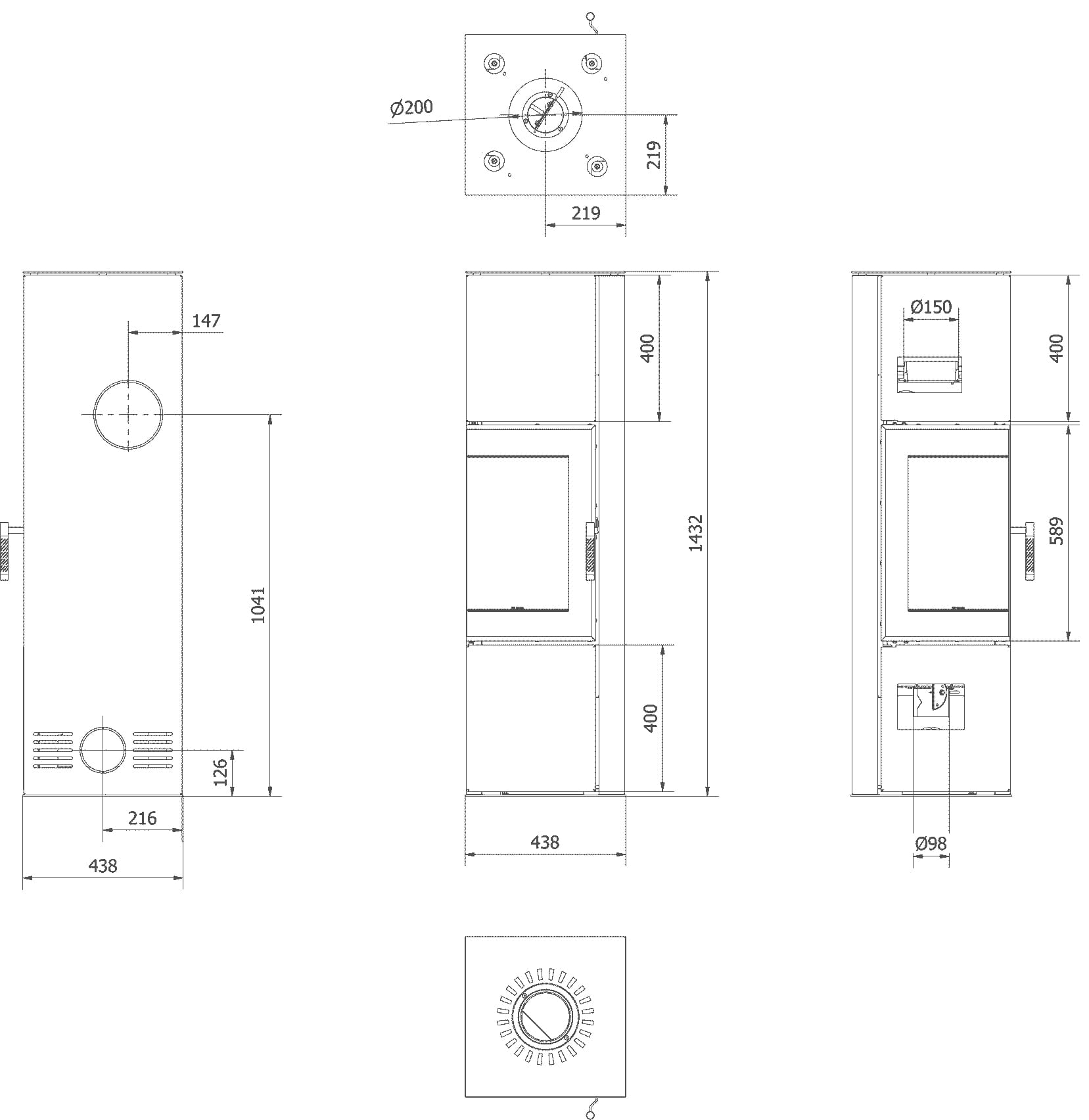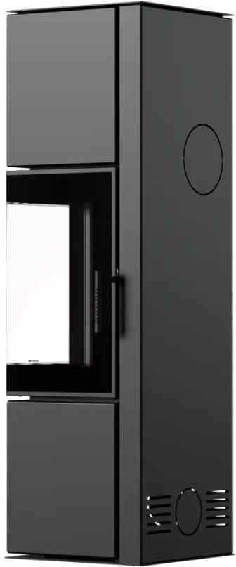 Форма печи — вертикальный прямоугольник. На дне топки есть колосник с расположенным под ним зольным ящиком. Стенки топочной камеры футерованы термоустойчивым материалом Termotec (Термотек) белого цвета. Нижнюю часть устройства можно использовать в качестве дровника. Для отвода продуктов сгорания необходим дымоход диаметром 150 мм, который подключается сверху или сзади.
