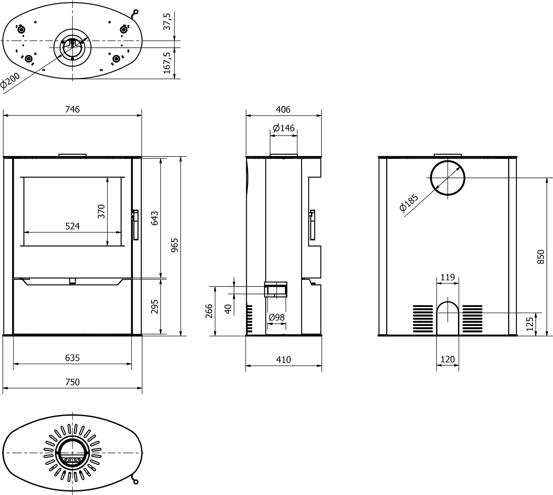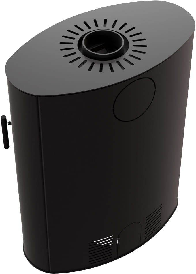 Форма печи напоминает цилиндр. На дне топки есть колосник с расположенным под ним зольным ящиком. Стенки топочной камеры футерованы термоустойчивым материалом Termotec (Термотек) белого цвета. Нижнюю часть устройства можно использовать в качестве дровника. Для отвода продуктов сгорания необходим дымоход диаметром 150 мм, который подключается сверху или сзади.