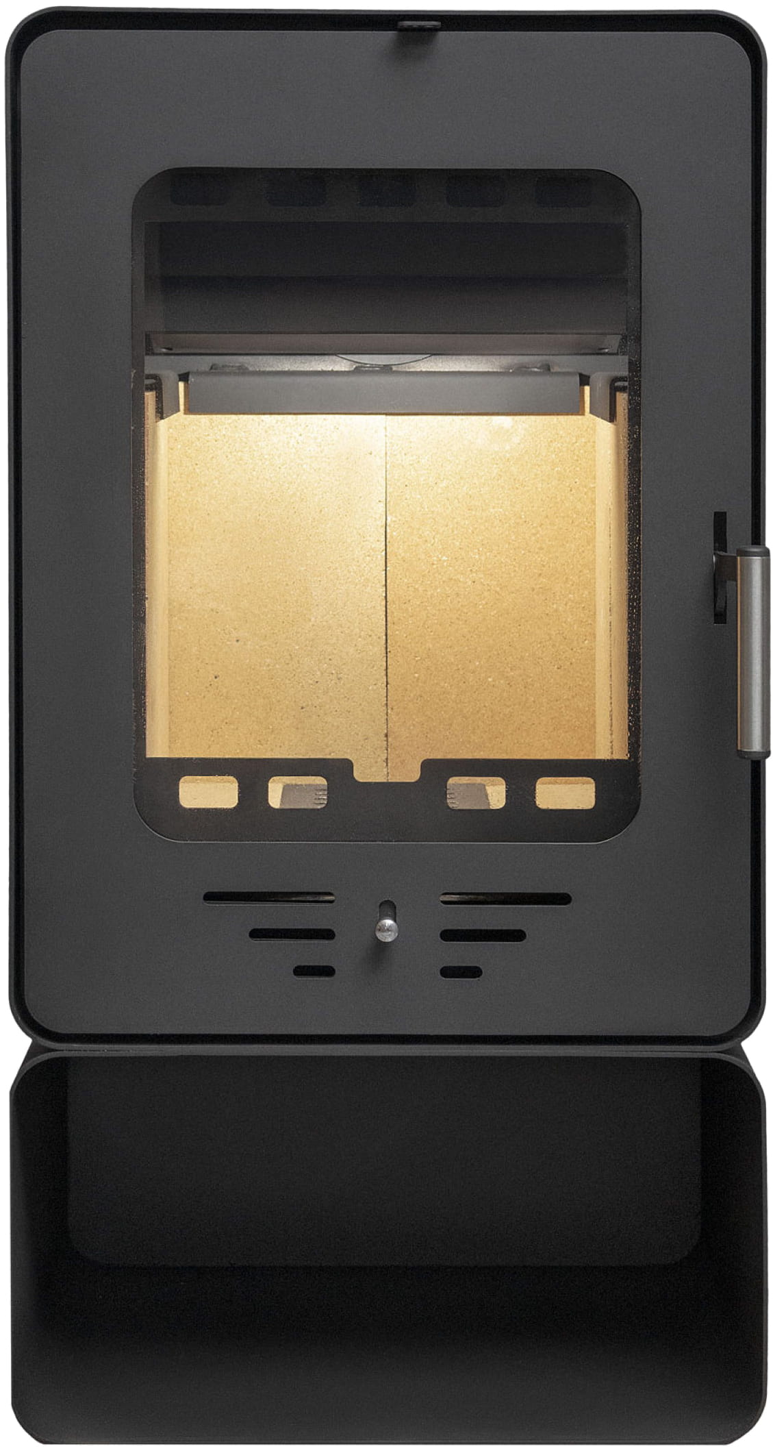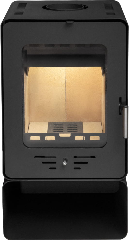 Прямое стекло открывает отличный вид на огонь. Модель оснащена системой "Чистое стекло". Футеровка топки выполнена из шамота. Небольшие размеры и стильный дизайн модели подойдут под любой интерьер. Нижняя часть устройства в виде отдельной ниши, которую можно использовать как дровник. Дымоход диаметром 150 мм подключается сверху или сзади.