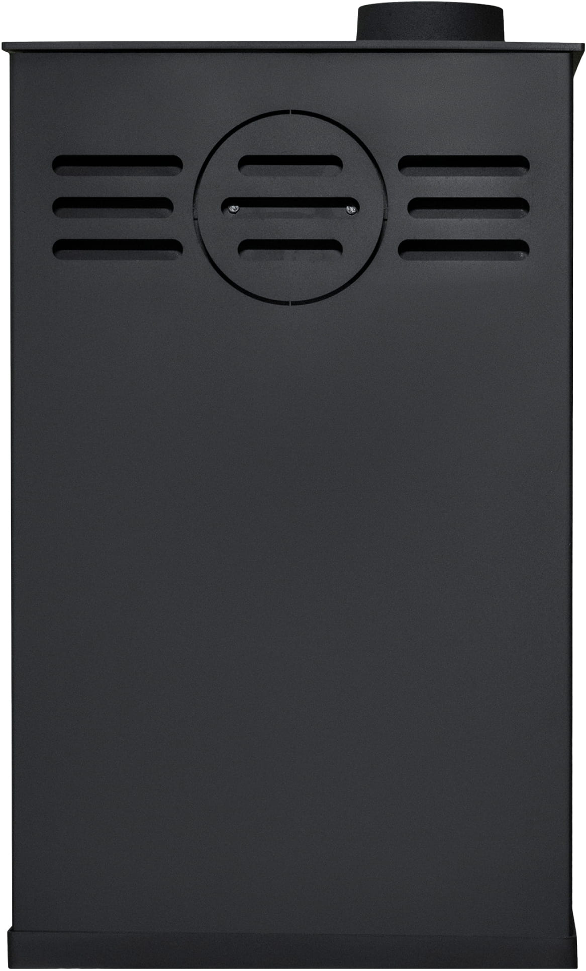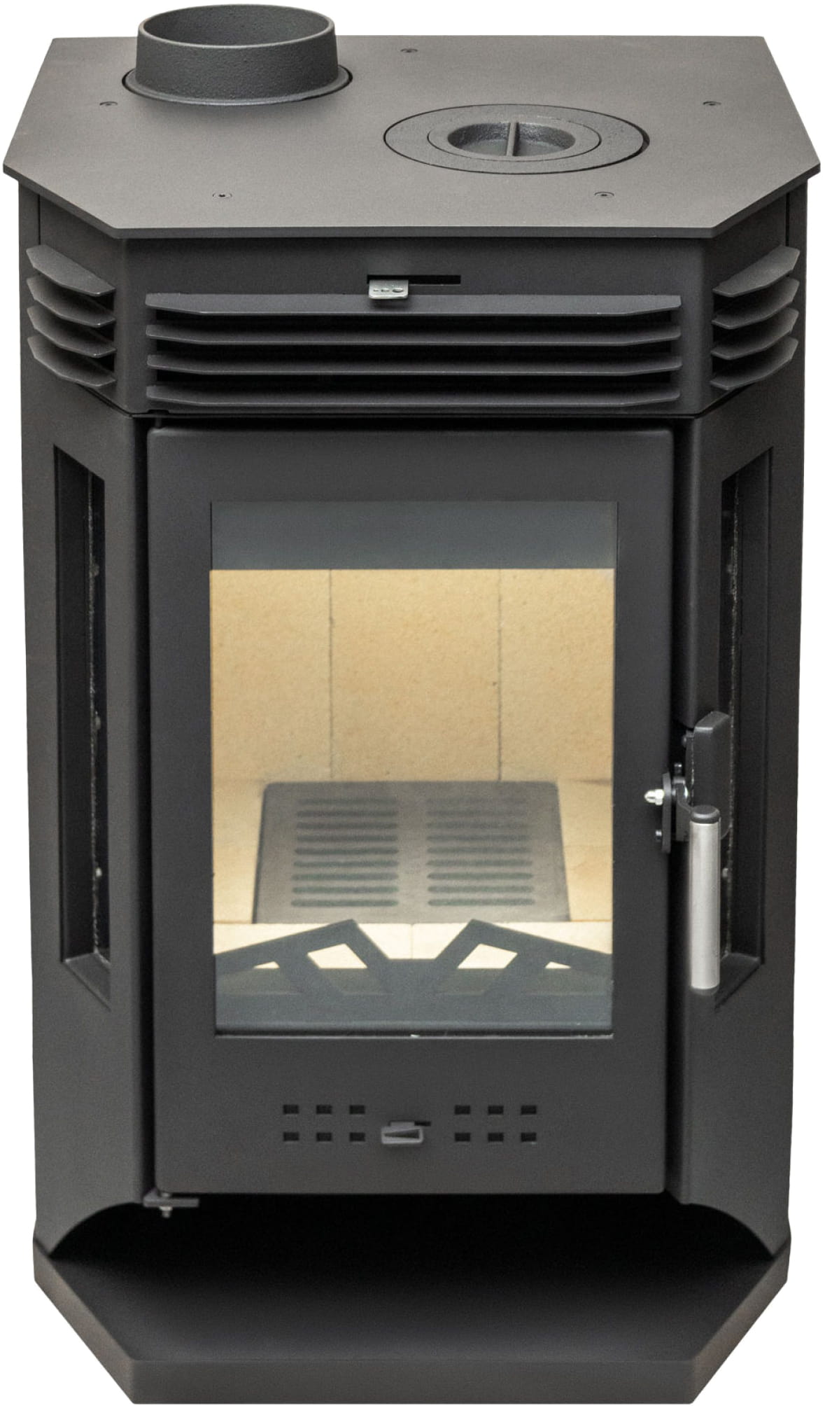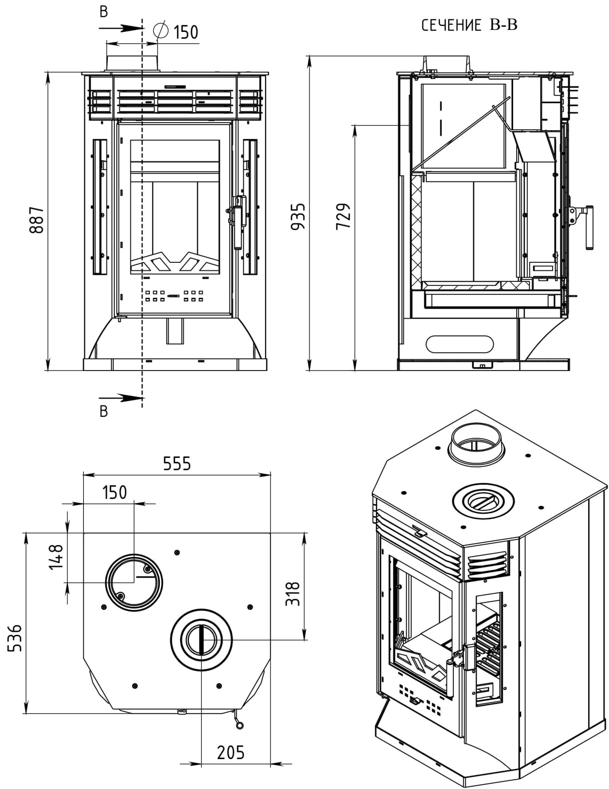 Три независимых стекла открывают отличный вид на огонь. Модель оснащена системой "Чистое стекло". Футеровка топки выполнена из шамота бежевого цвета. Внизу расположена ниша, которую можно использовать как дровник. На верхней панели размещена варочная поверхность для приготовления пищи или напитков. Дымоход диаметром 150 мм подключается сверху или сзади. При заднем подключении дымохода верхний выход можно использовать как дополнительную конфорку.